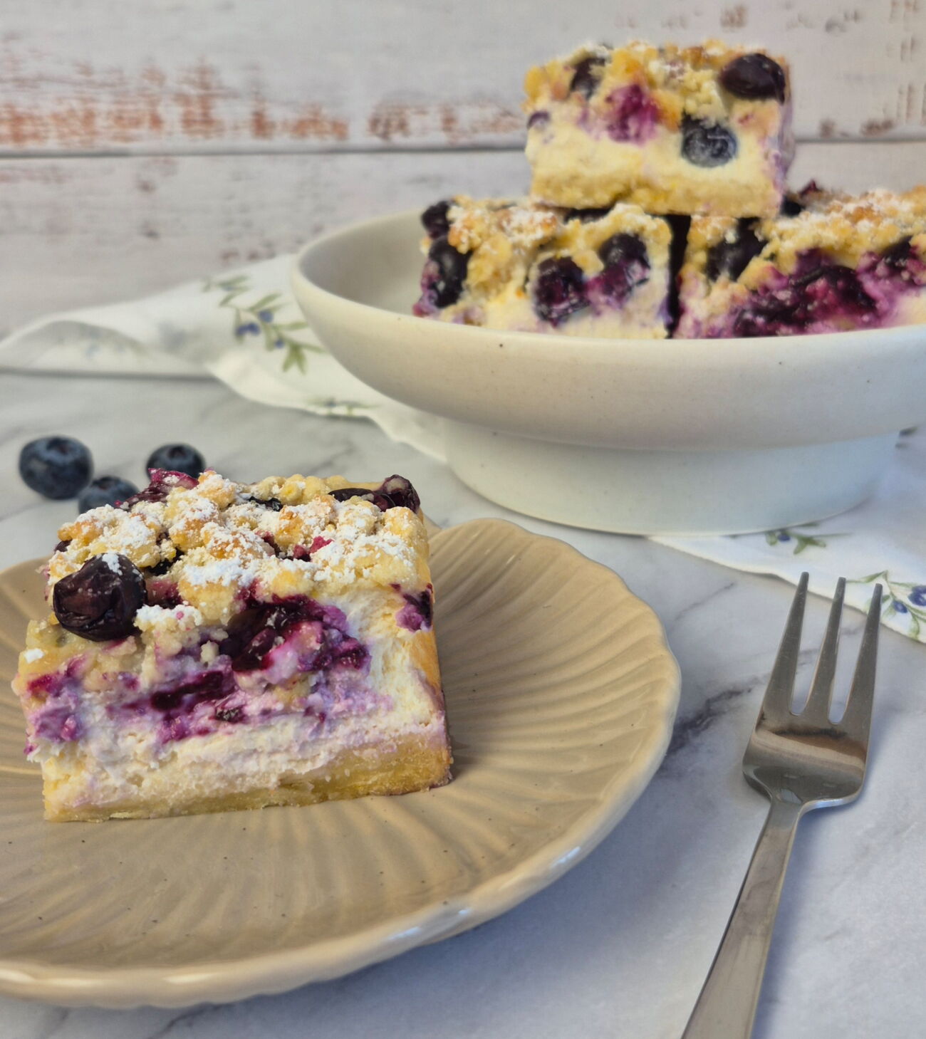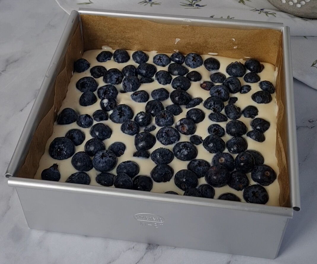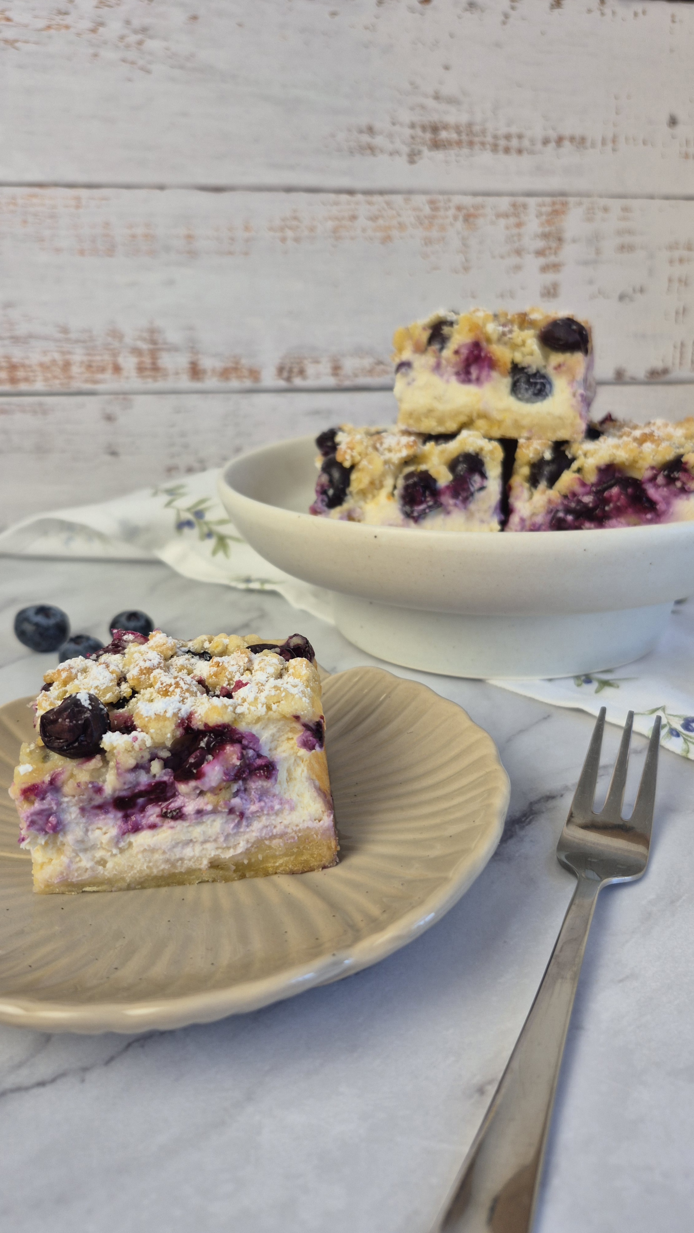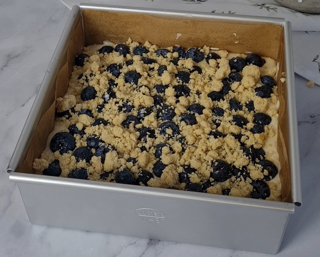 Vanille-Cheesecake-Schicht mit saftigen Blaubeeren und knusprigen Streuseln. Unglaublich lecker und super leicht zu machen.
