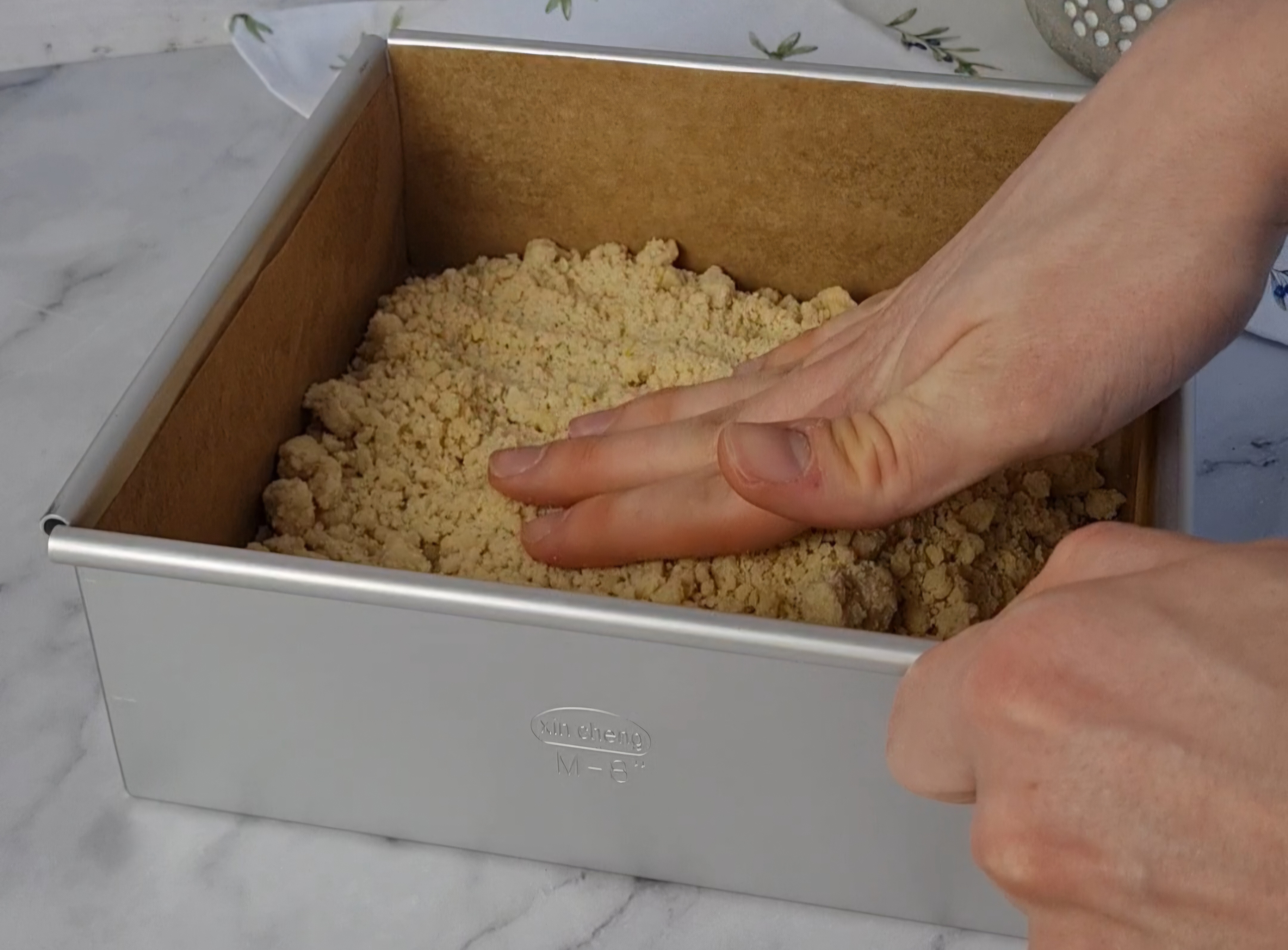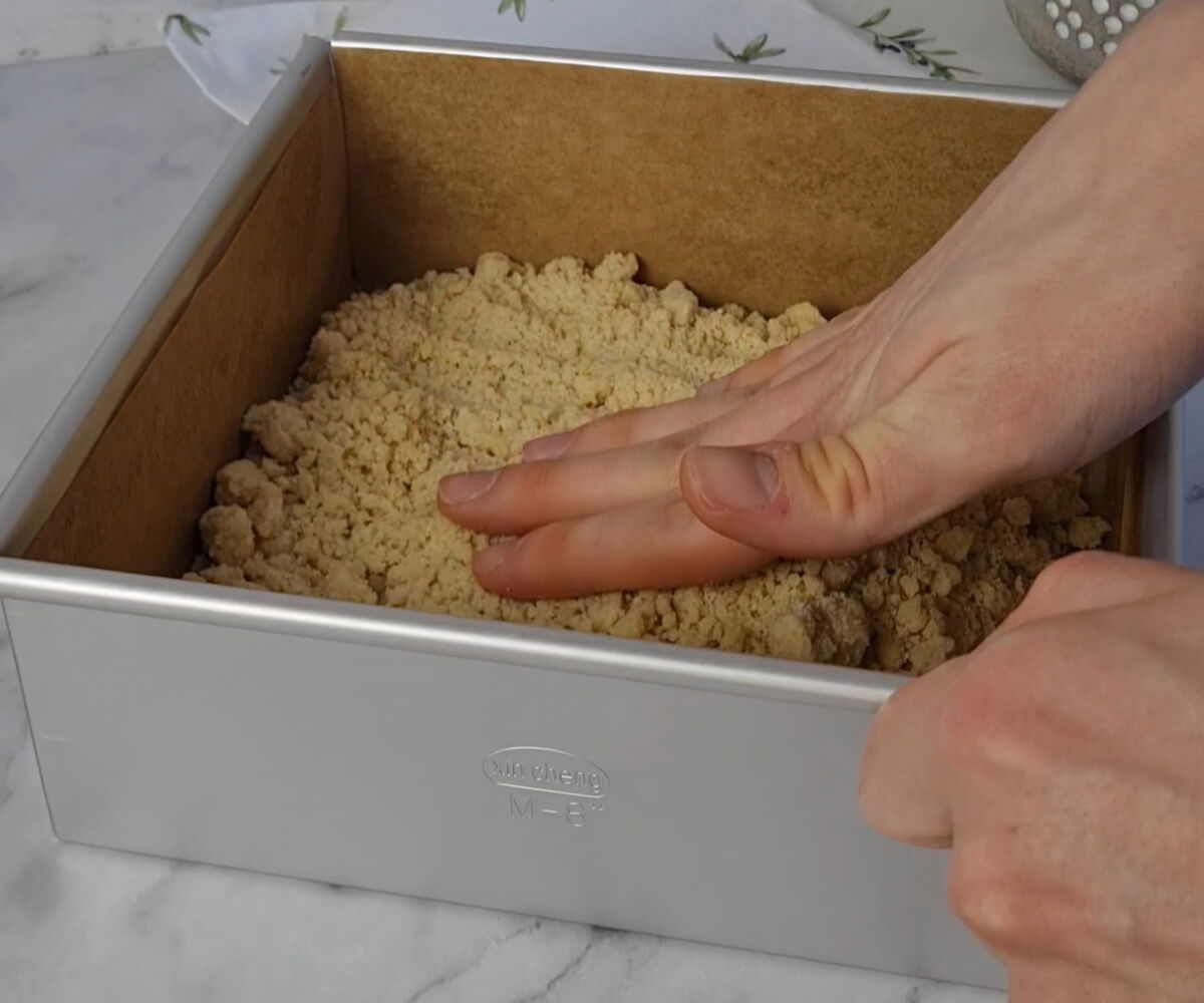 Nun ⅔ von den Streuselteig in die mit Backpapier ausgelegte Backform drücken und mithilfe einer Winkelpalette glattstreichen. Das restliche Drittel des Teiges bis zur Weiterverarbeitung kühl stellen. Den Mürbeteigboden im nächsten Schritt erst für 10 Minuten blindbacken und anschließend die Backerbsen mit dem Backpapier entfernen und für weitere 10 Minuten backen. Nach der Backzeit den Boden aus dem Ofen nehmen und lauwarm abkühlen lassen.