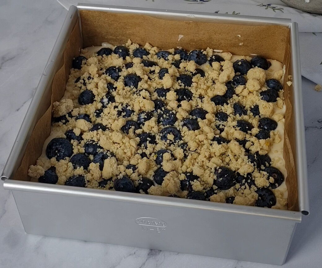 Nun die Füllung über den warmen Mürbeteigboden gießen und glattstreichen. Anschließend die Blaubeeren und restlichen Streuseln zu gleichen Teilen auf die Cheesecake-Masse geben und für etwa 40-45 Minuten backen, bis die Streusel goldbraun sind und die Füllung beim Rütteln der Backform noch ein wenig wackelt. Nach der Backzeit den Cheesecake vollständig auf Zimmertemperatur abkühlen laasen und danach für weitere 2 Stunden zum fest werden in den Kühlschrank stellen.