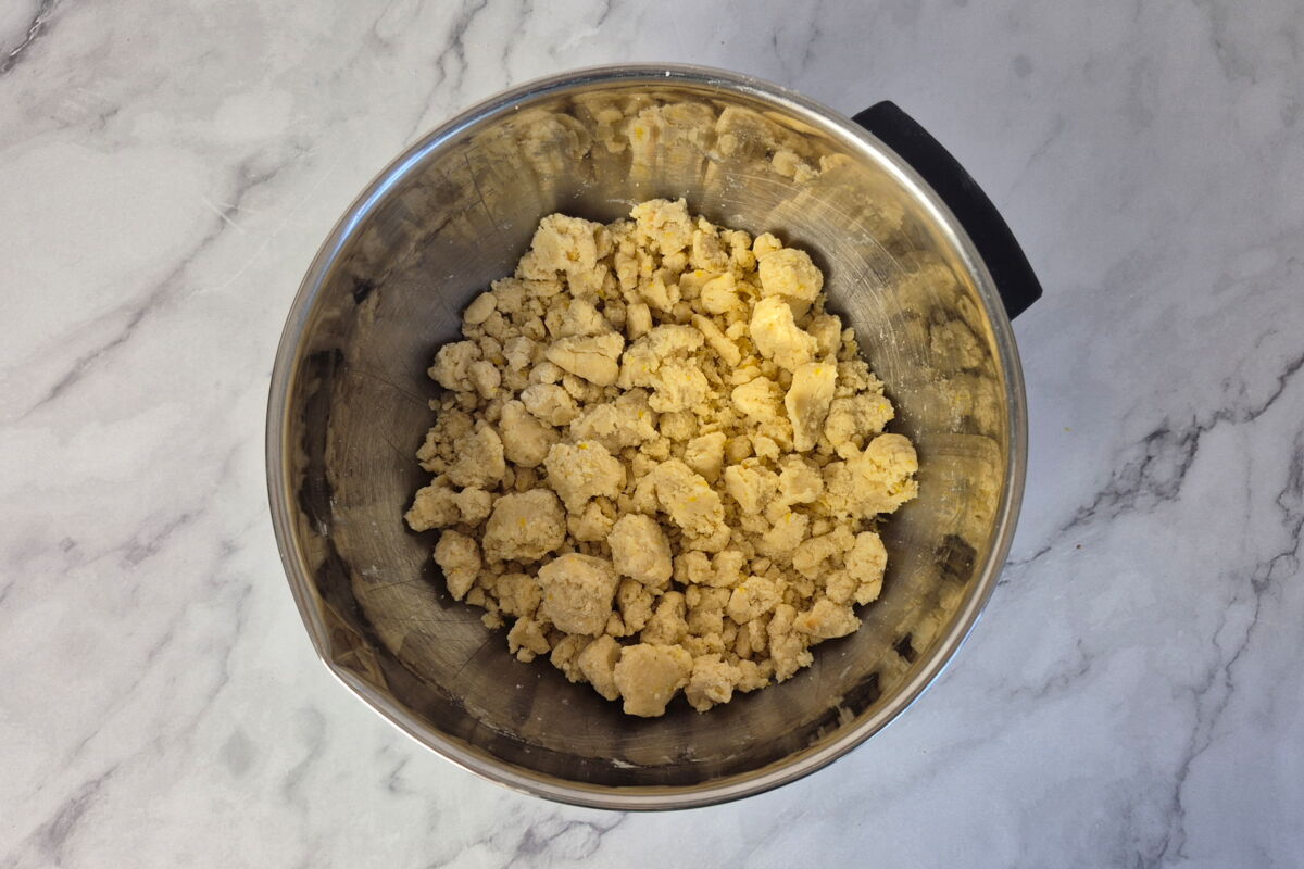 Für den Mürbeteig den Puderzucker in eine Schüssel sieben und zusammen mit den restlichen zu Streuseln verarbeiten.