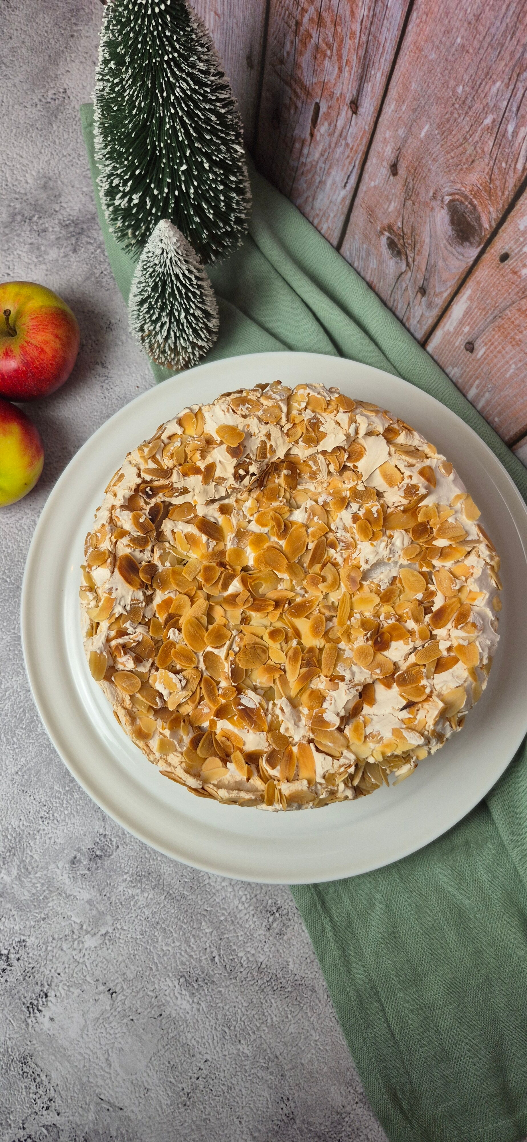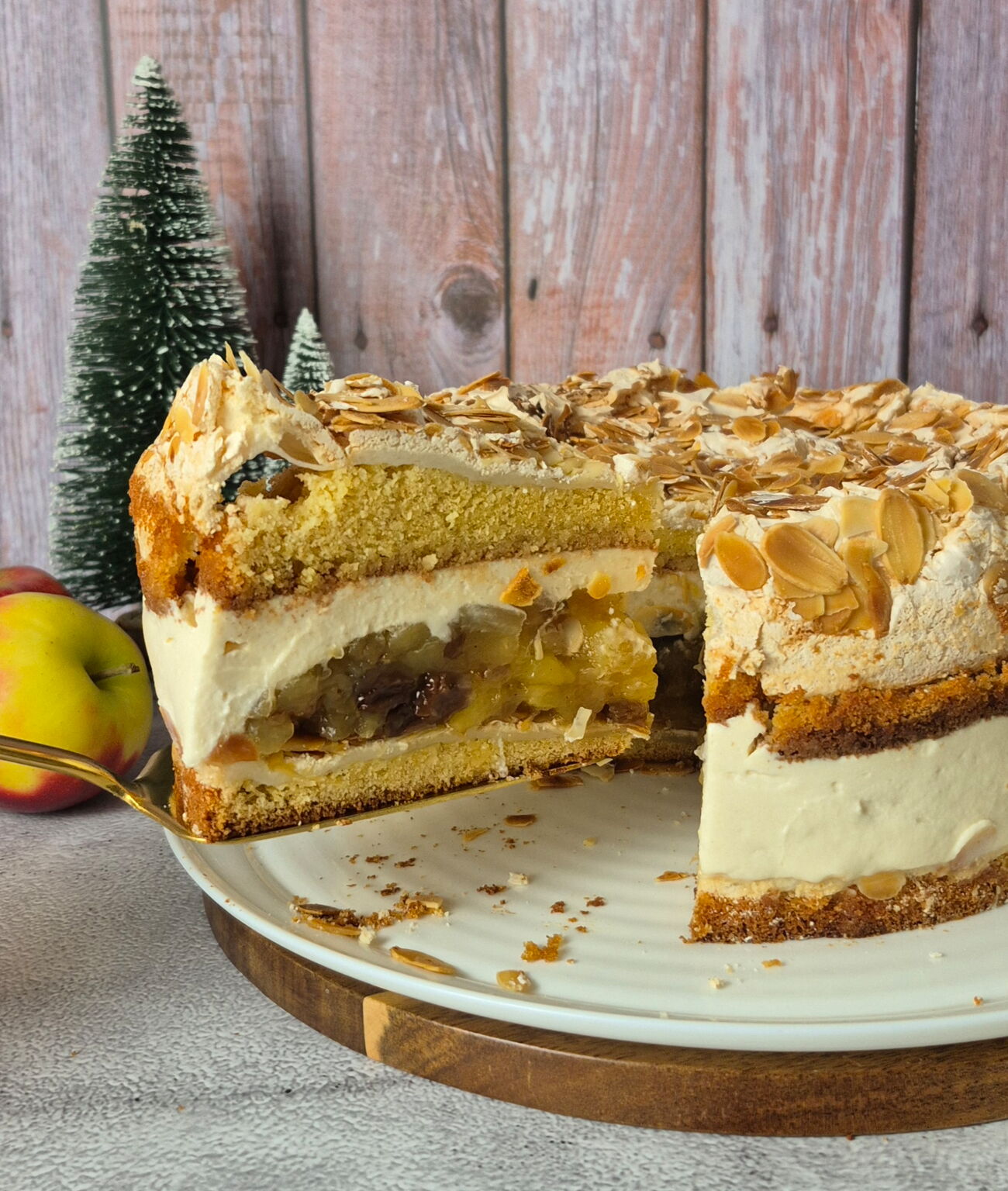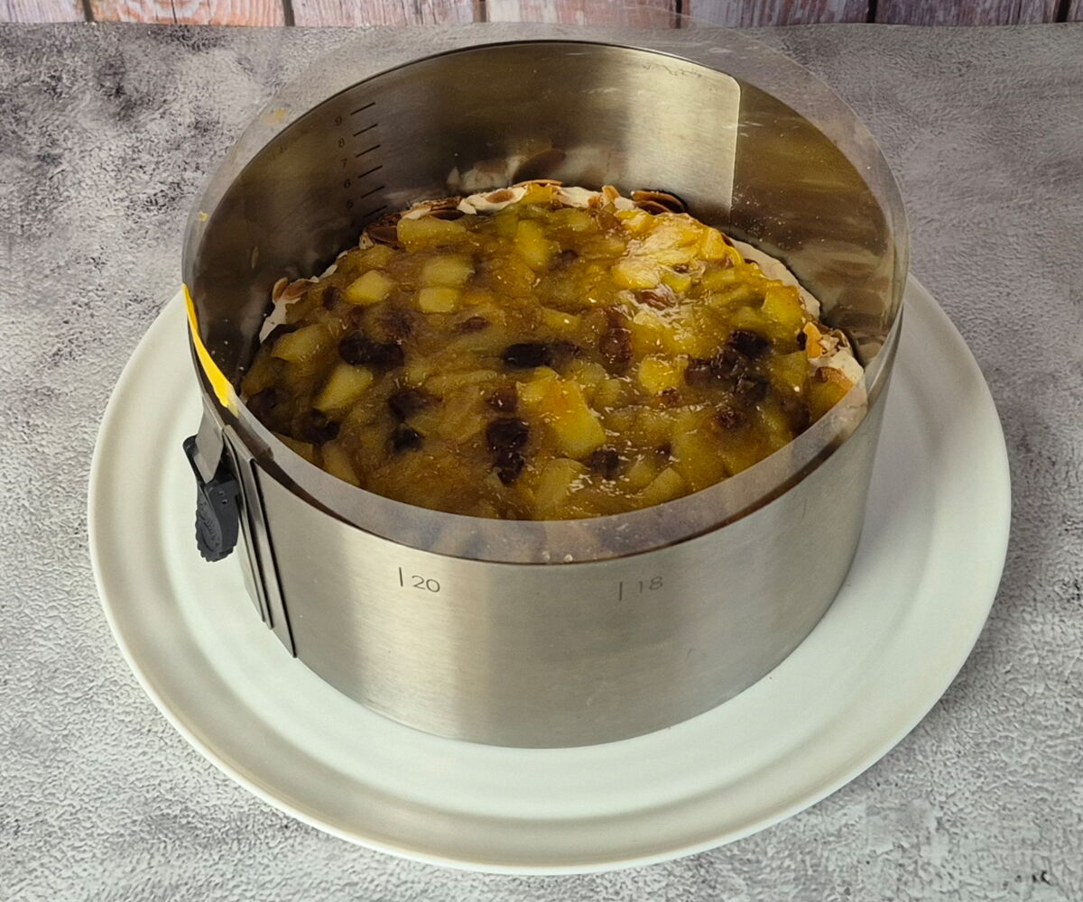 Den Tortenring mit Tortenrandfolie optional um einen Boden stellen und den Bratapfelkompott darauf verteilen, dabei einen aüßeren Rand von 1cm frei lassen. Im nächsten Schritt die Mascarpone-Schmand-Creme auf den Kompott geben und gleichmäßig verstreichen.