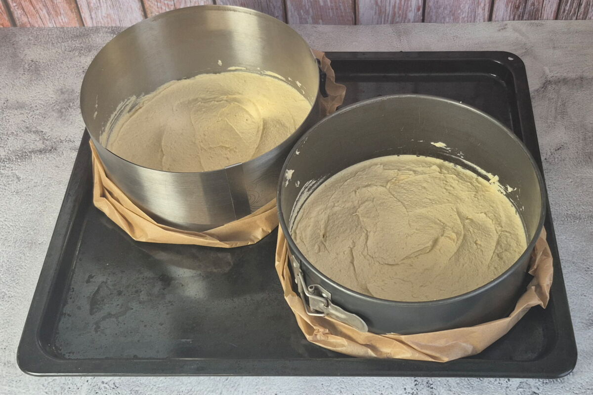alternativ: Milch hinzugeben und alles zu einem geschmeidigen Teig verrühren. Den Teig gleichmäßig in dedn zwei vorbereiteten Springformen streichen und beiseite stellen.