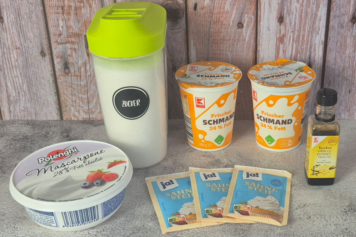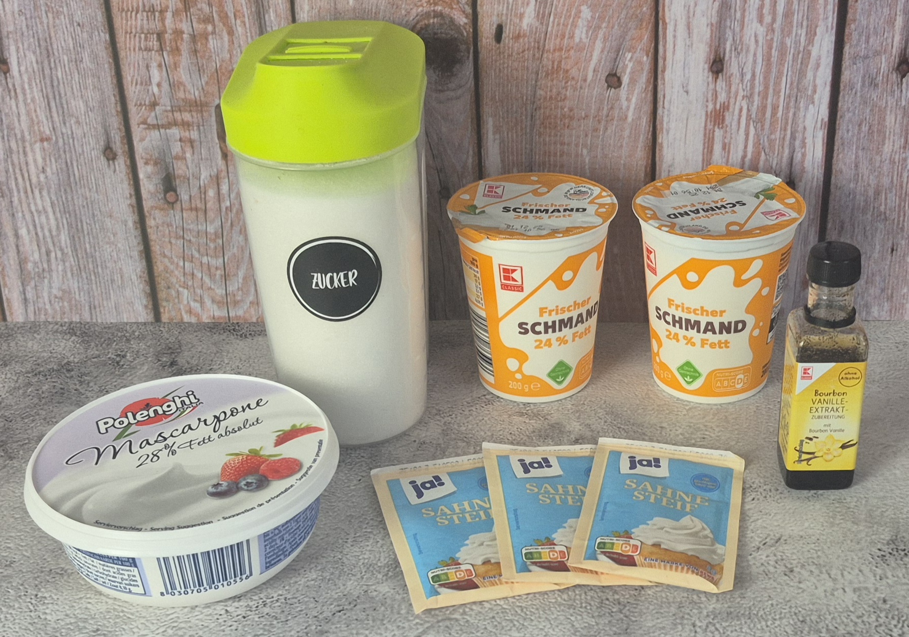 Für die Creme alle Zutaten zu einer homogenen Masse aufschlagen und bis zur Weiterverarbeitung kühl stellen.