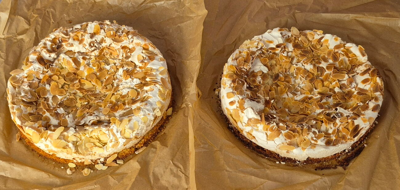 Wenn sich alle Zutaten verbunden haben und der Zucker sich aufgelöst hat, die Baisermasse auf dem schon aufgestrichenen Teig verteilen. Zum Schluss die Mandelblättchen oben aufstreuen und alles für etwa 35 Minuten im vorheizten Ofen backen.