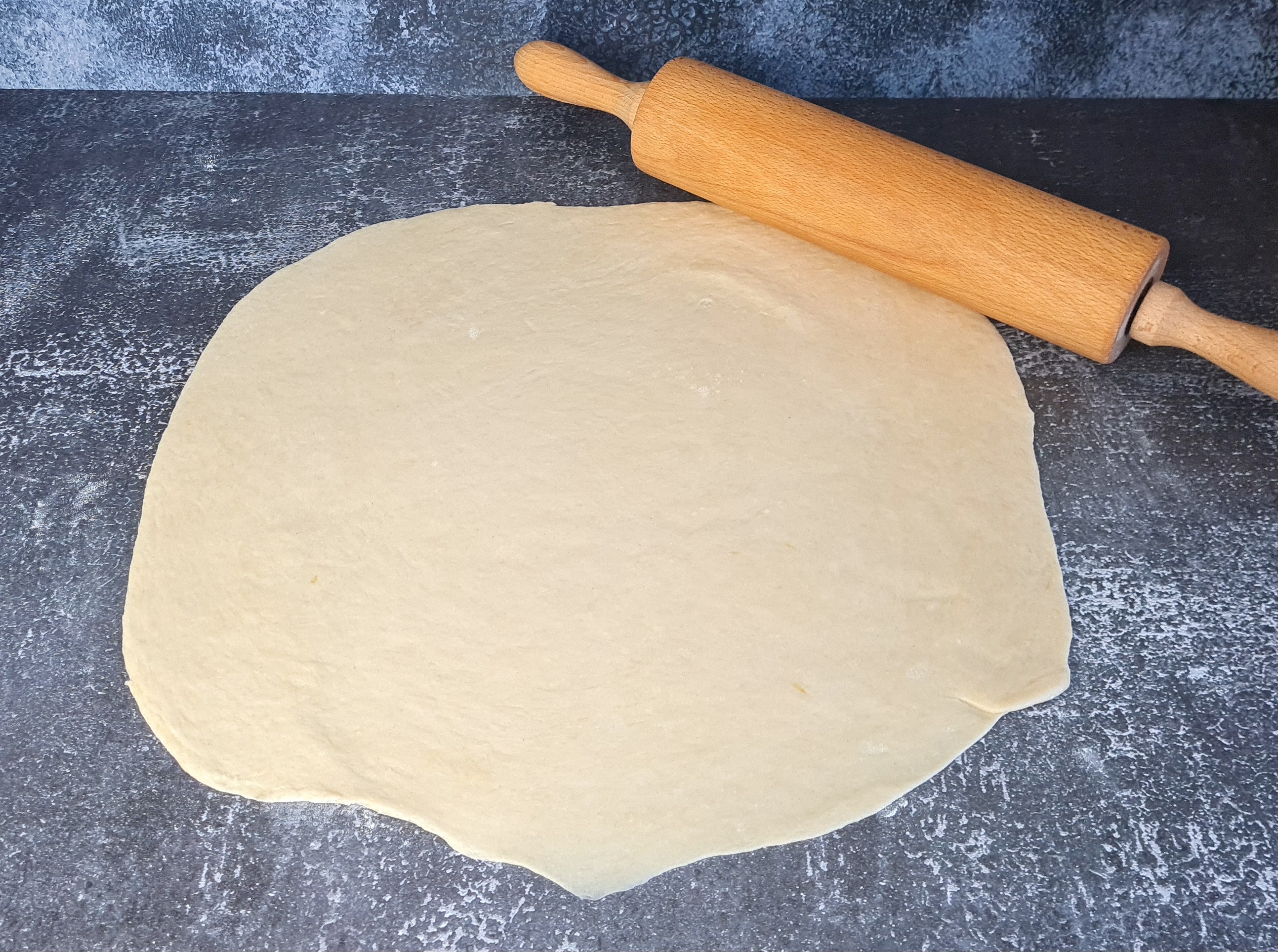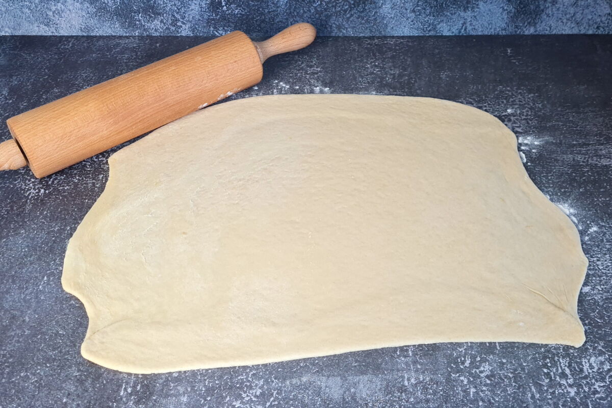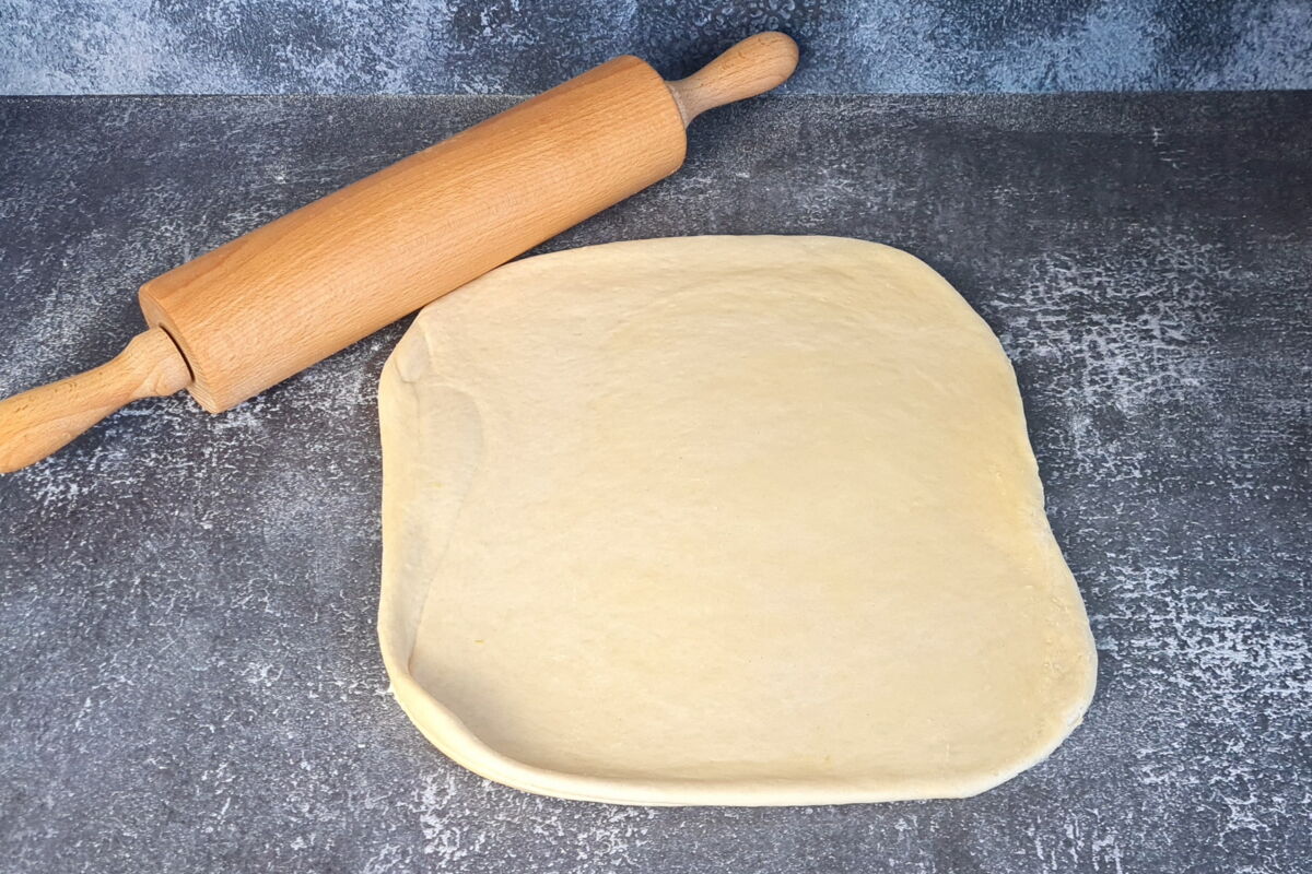 Im nächsten Schritt den Backofen auf 190°C Ober-/Unterhitze vorheizen und das Backblech mit Backpapier auslegen. Die Arbeitsfläche mit etwas Weizenmehl bestäuben, den gekühlten Teig ausrollen und die vorbereitete Butterplatte (Ziehbutter) darin einschlagen.