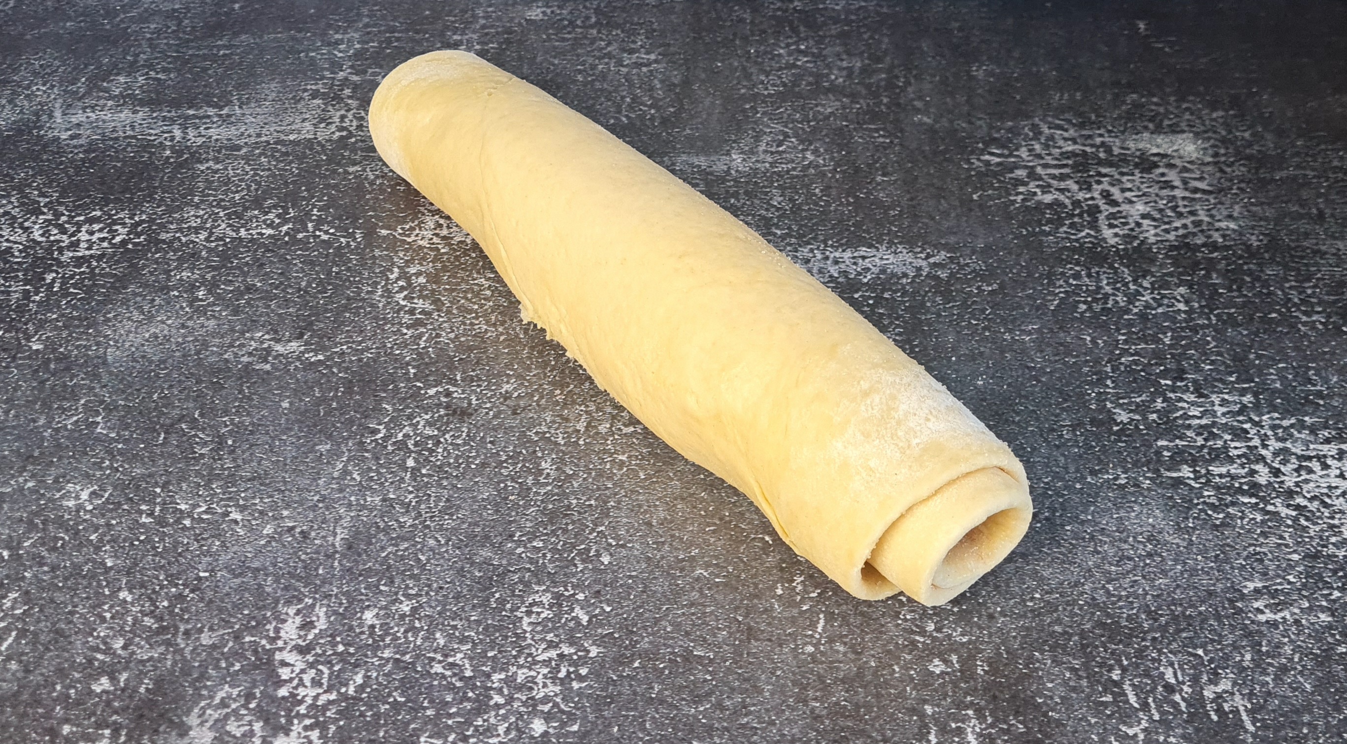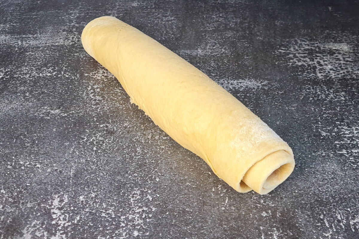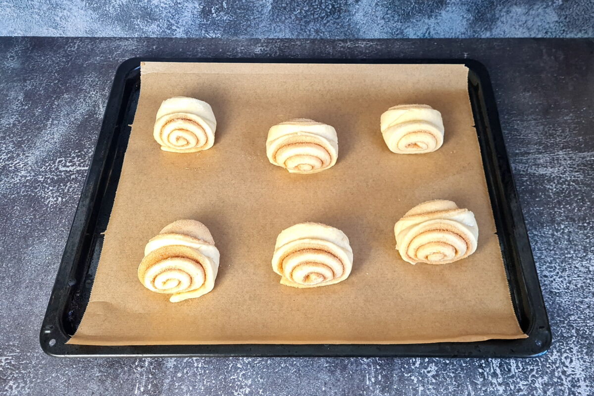Den ausgerollten Teig mit der geklärten Butter bestreichen und den Zimtzucker darauf bestreuen. Den Plunderteig nun von der kurzen Seite her aufrollen und diese dann in etwa 6 Stücke à 5cm schneiden. In jedes Stück mit dem Stiel eines Holzlöffels parallel zu den Schnittkanten eine tiefe Kerbe in die Mitte setzen. Die Schnittkanten mit den Fingern ein wenig in Richtung der Kerbe drücken, damit sie später schön aufspringen.