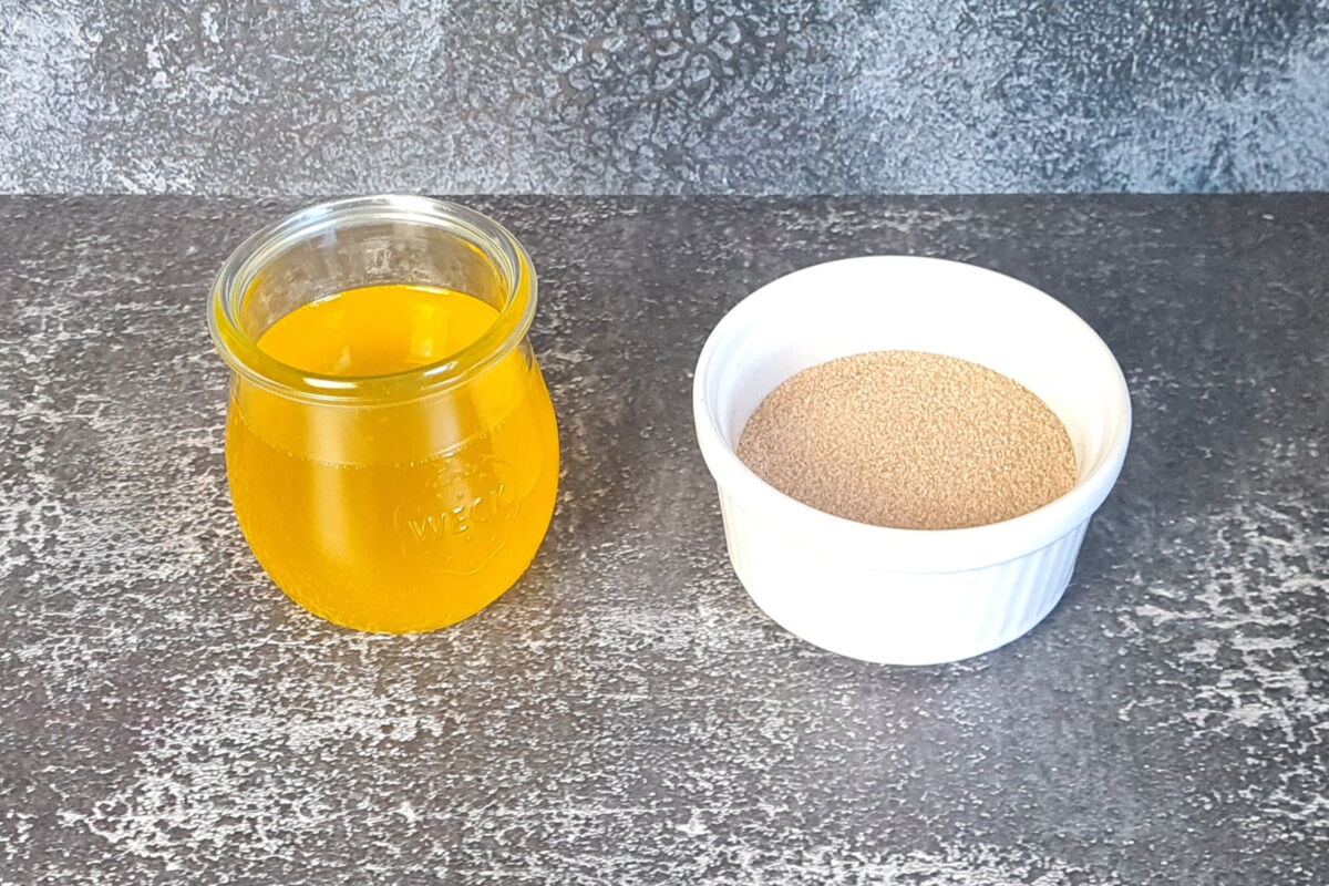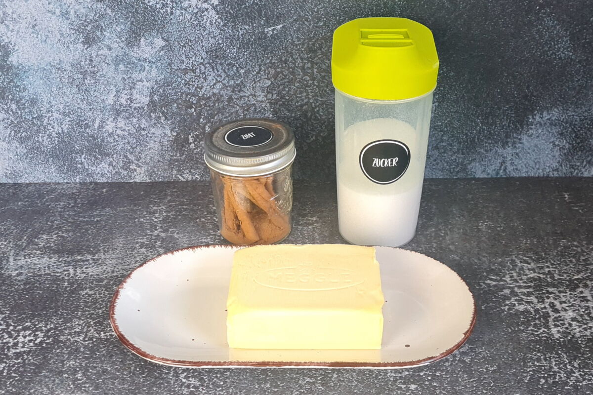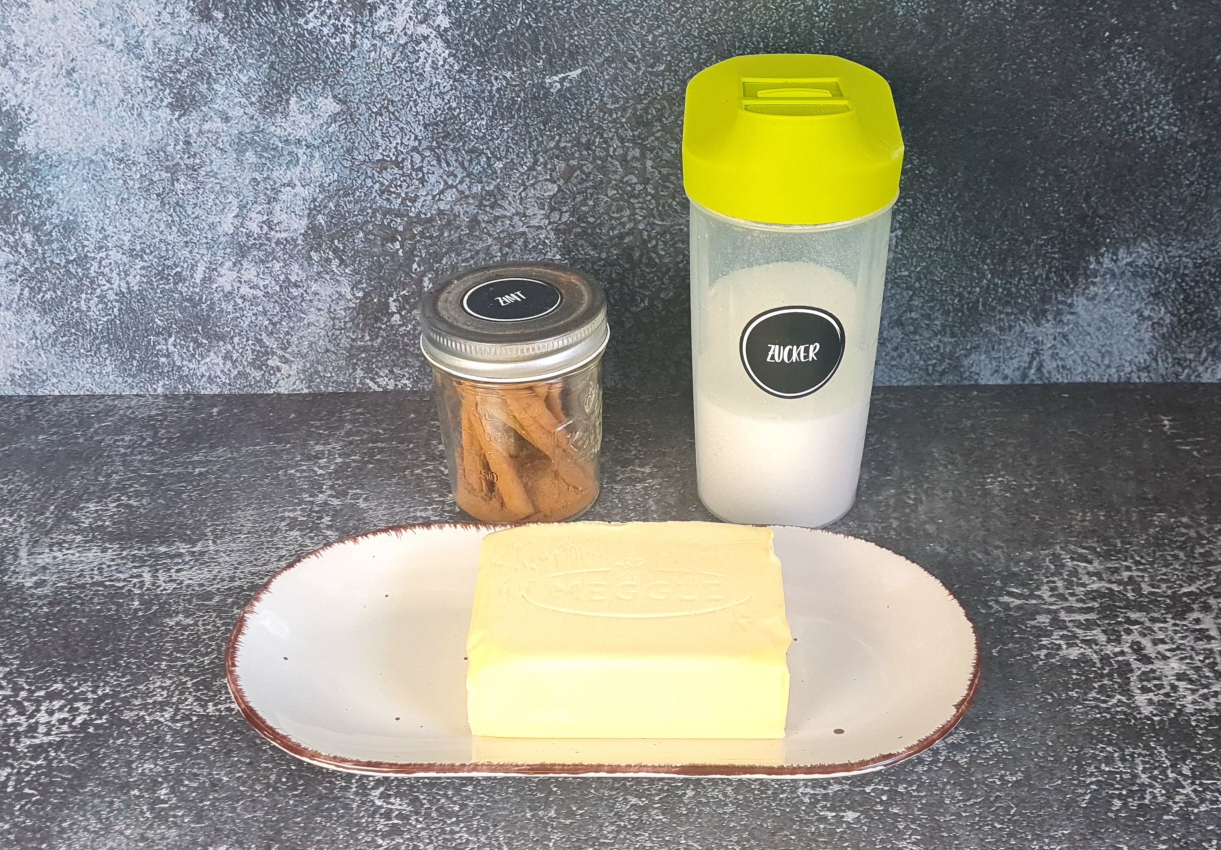 Den Zimt und Zucker miteinander vermischen und die Butter in einem kleinen Topf vorsichtig schmelzen, bis die Molke sich abgesetzt hat und die Butter klar aussieht. Die flüssige Butter für die weitere Verarbeitung etwas abkühlen lassen.