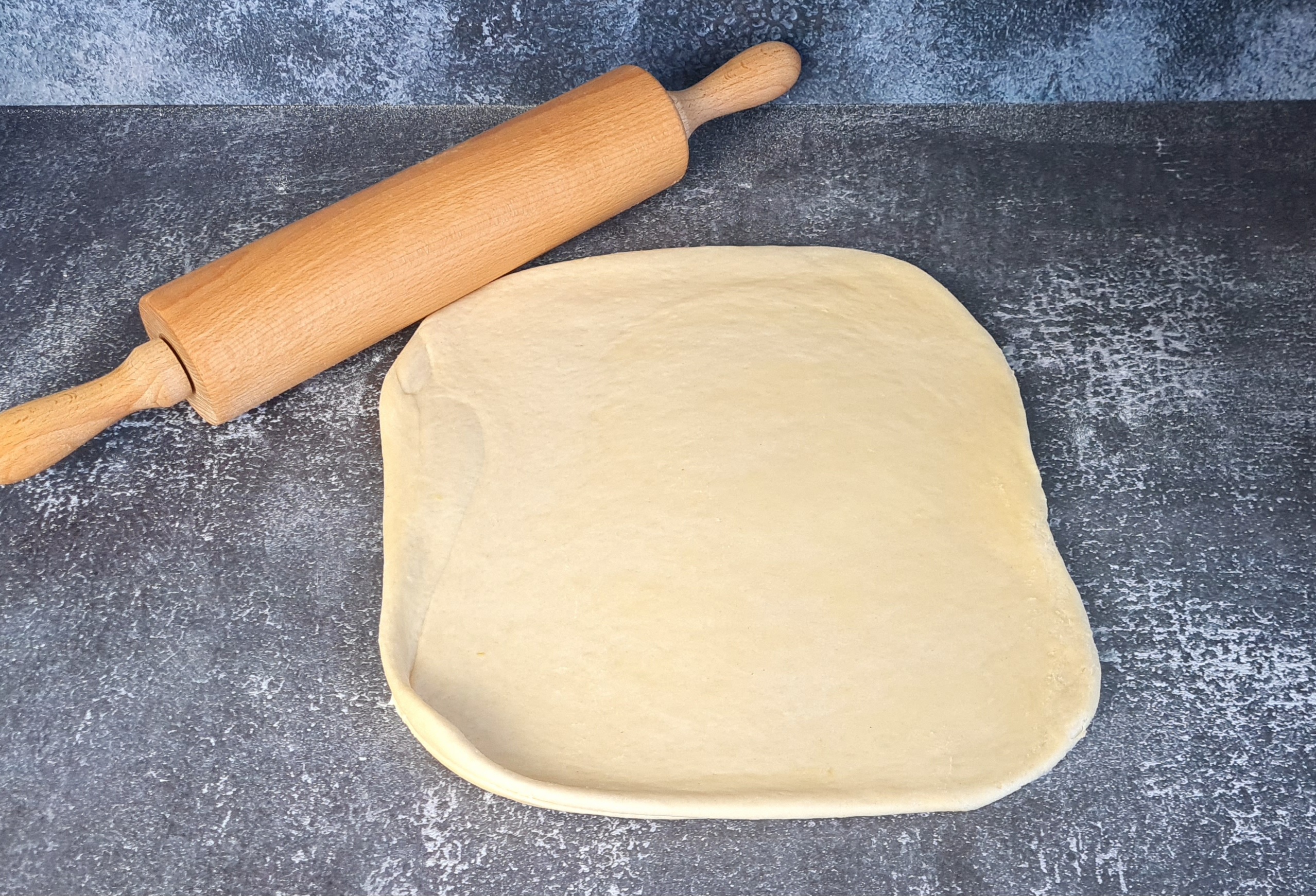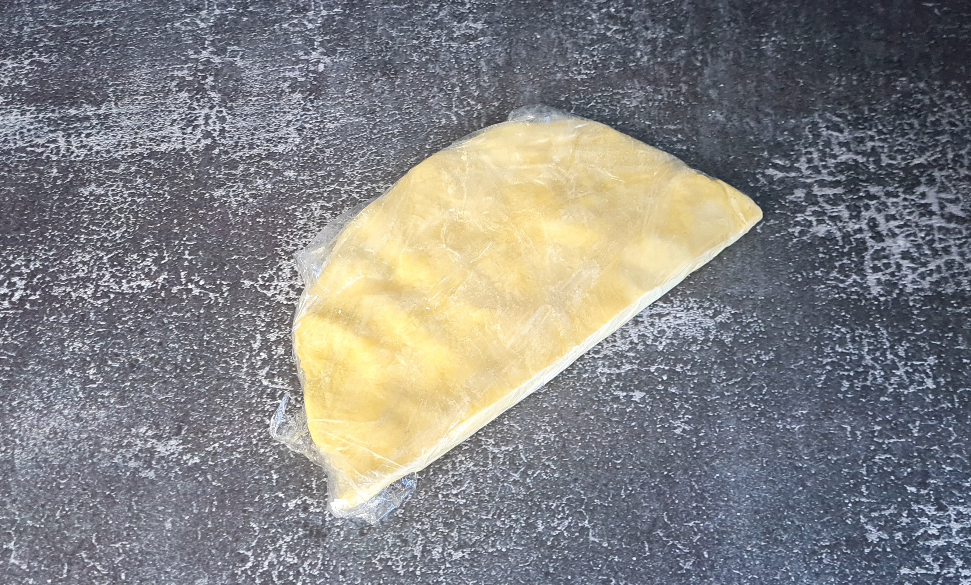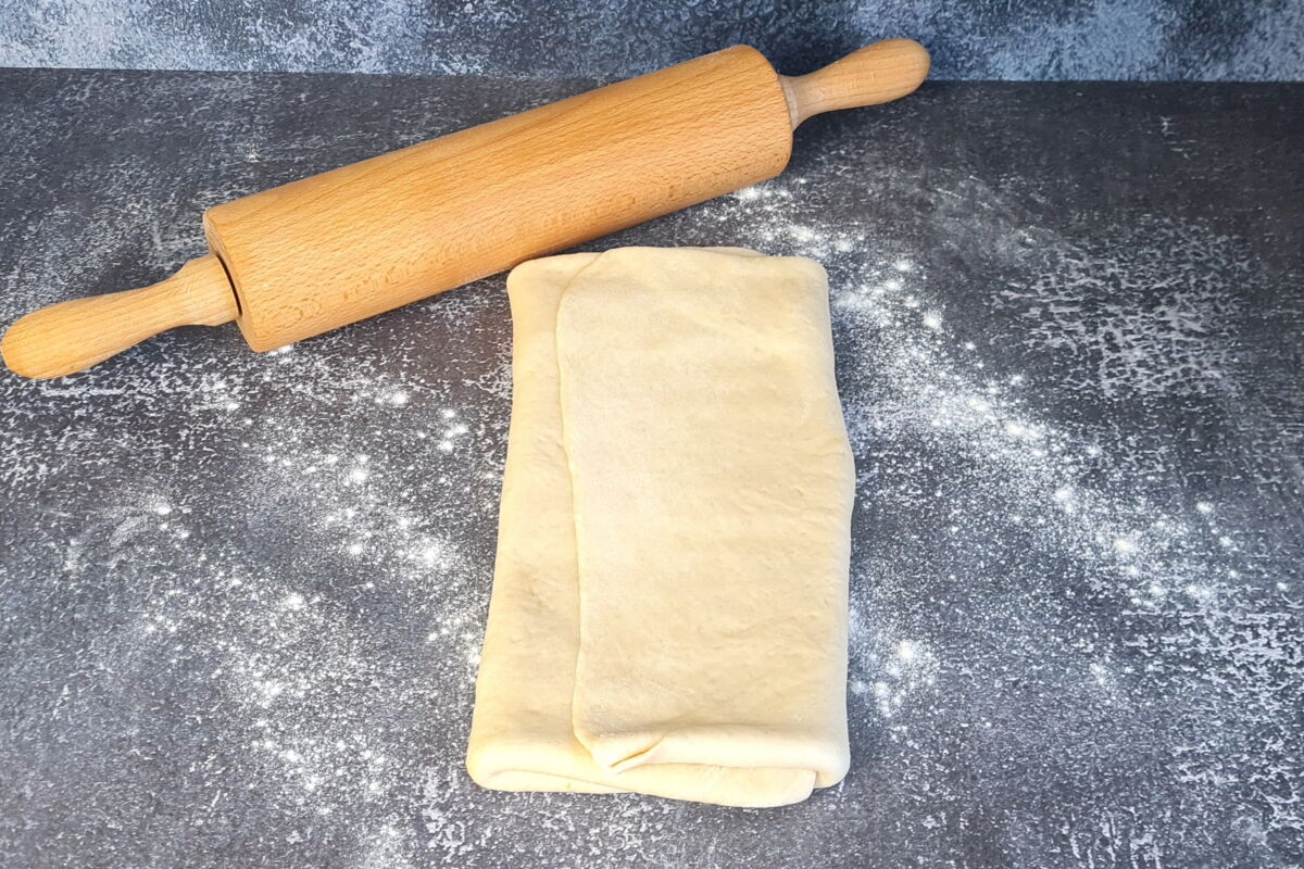 Nun bekommt der Plunderteig zwei einfache Touren: Den Teig zu einem länglichen Rechteck ausrollen, auf ⅓ der Fläche ineinander falten, sodass drei Teigschichten übereinander liegen. Anschließend foliert für 10 Minuten im Kühlschrank ruhen lassen. Danach den Teig um 90 Grad drehen, noch einmal zu einem Rechteck ausrollen und die zweite einfache Tour geben. Nochmals für etwa 10 Minuten foliert kühlen. Im Anschluss den Teig auf einer bemehlten Fläche auf 45x30cm ausrollen.