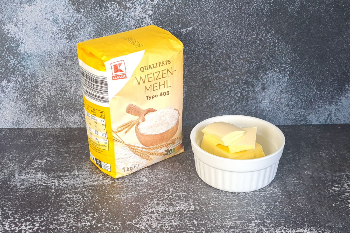 Zuerst die kalte Butter mit dem Weizenmehl verkneten und glattarbeiten. Anschließend die Ziehbutter zu einer rechteckigen Platte ausrollen und foliert in den Kühlschrank legen.