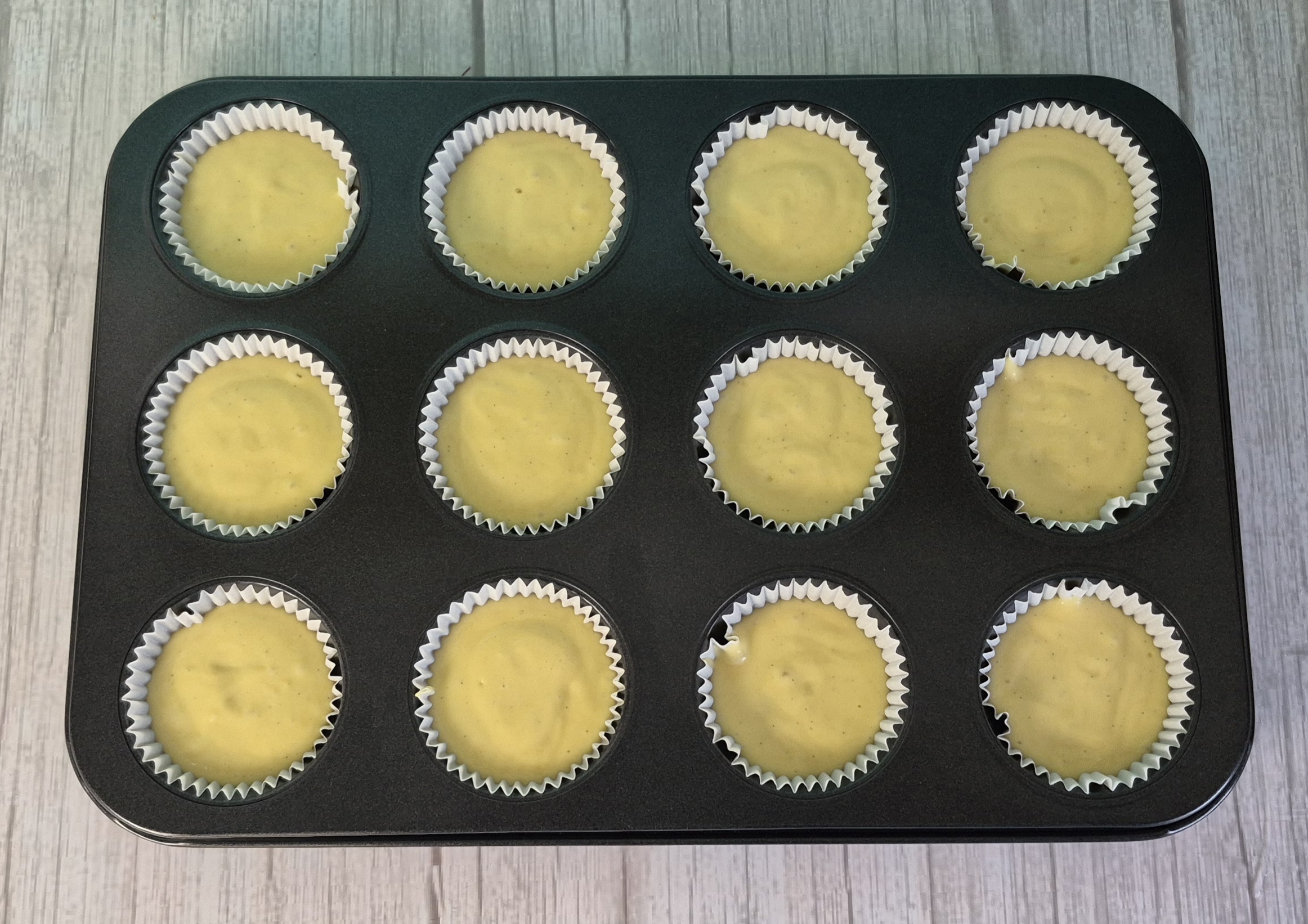 Zuerst den Backofen auf 180°C Ober-/Unterhitze vorheizen und ein Muffinblech mit Papierförmchen auslegen.