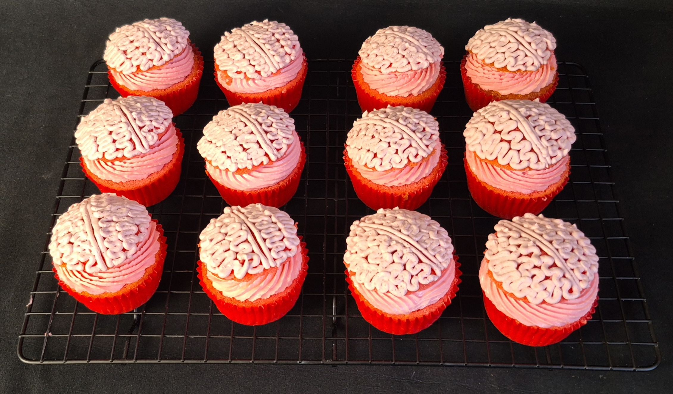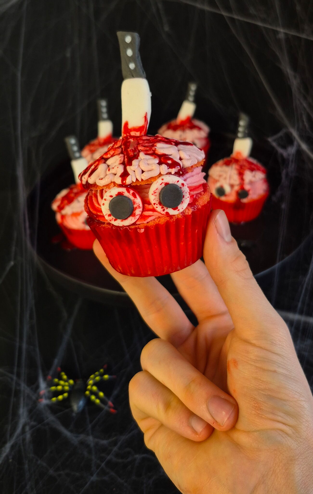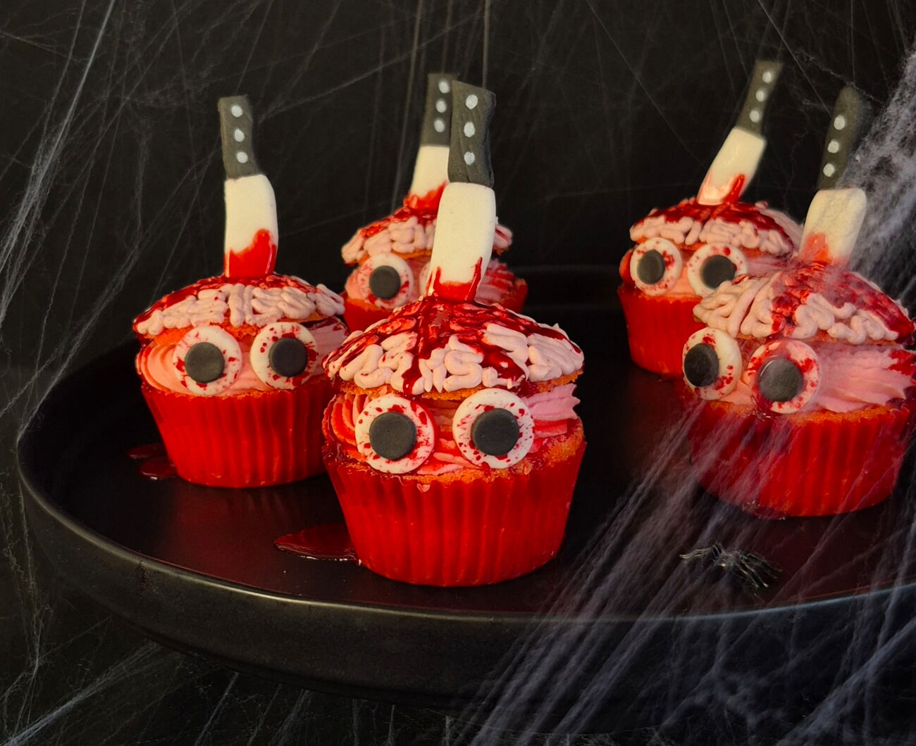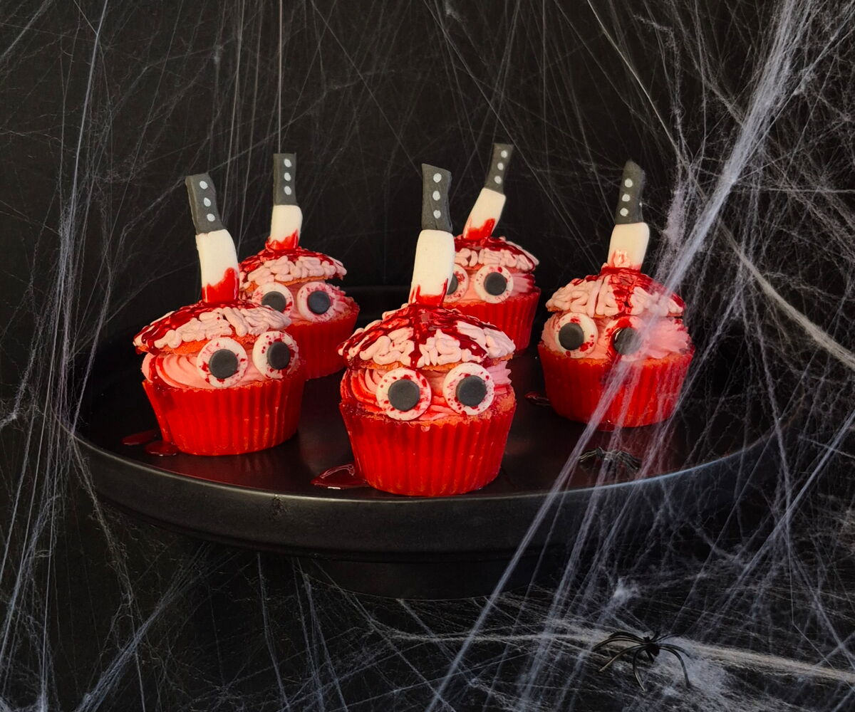 Die Augen an den Cupcakes befestigen und die Messer in die Haube vorsichtig eindrücken. Zu guter Letzt die kleinen Gehirne mit den Blutsirup schaurig verzieren und euren Liebsten servieren.
