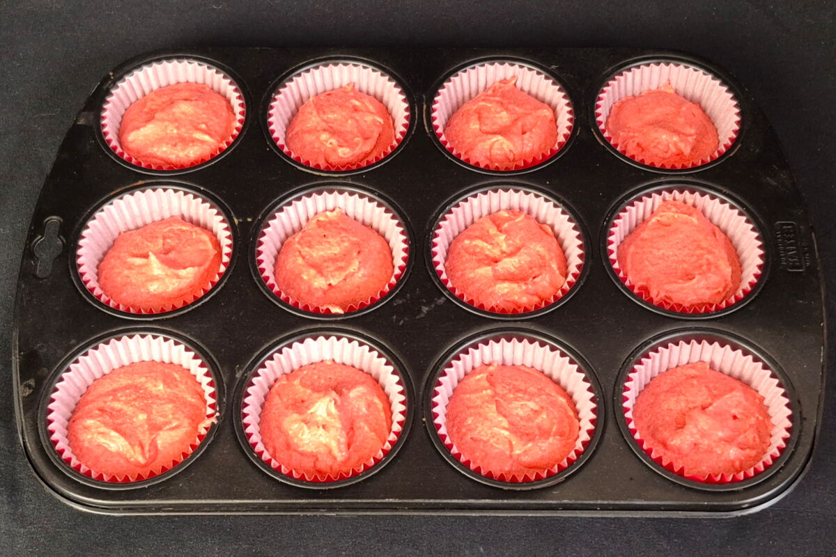 Den fertigen Muffinteig mit Hilfe eines Eisportionierers gleichmäßig auf die Muffinsförmchen aufteilen und für etwa 20 Minuten backen.