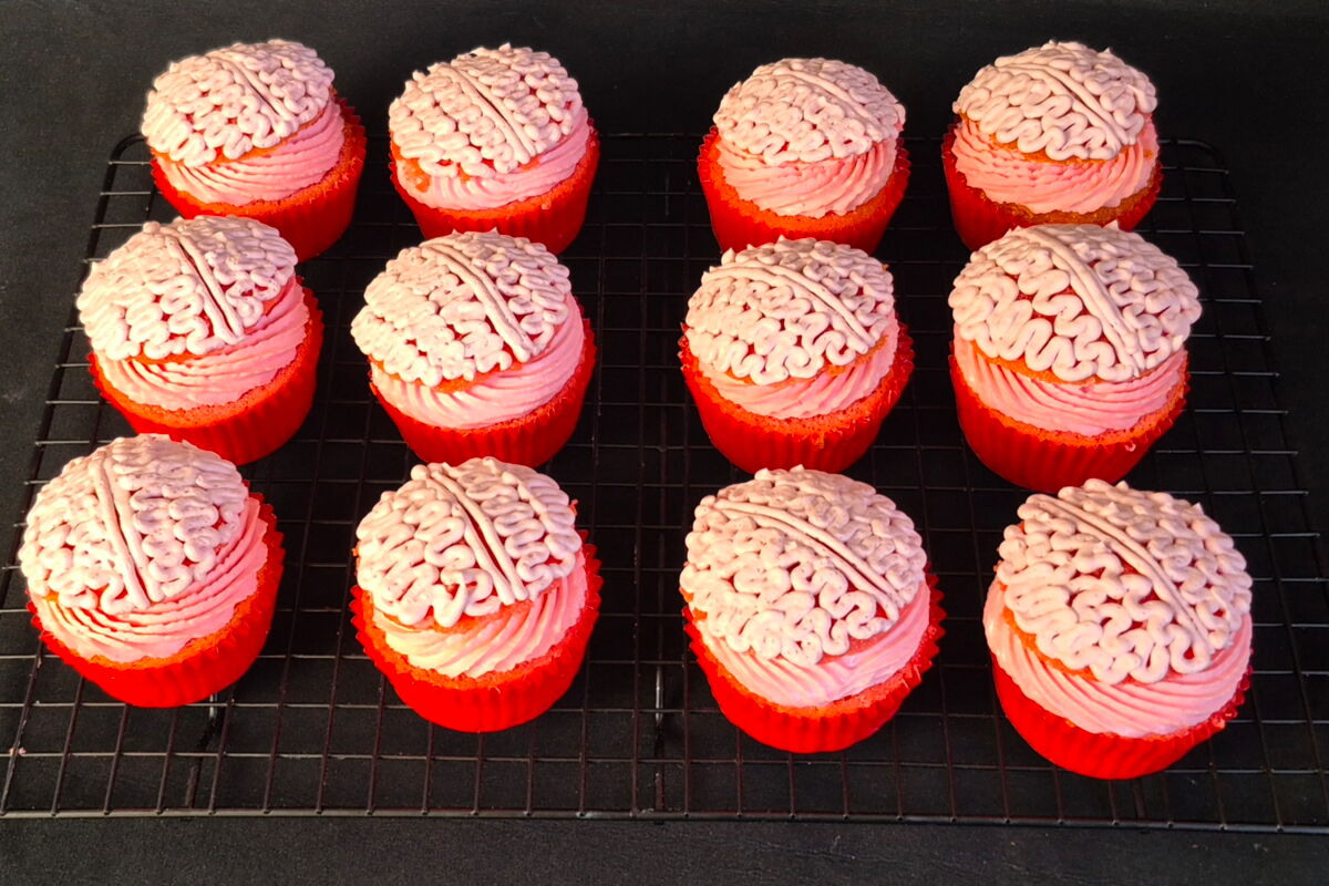 Nun die Haube von den ausgekühlten Muffins vorsichtig abschneiden und beiseitelegen. Die Creme auf zwei Spritzbeutel mit jeweils verschiedener Tülle (Stern und Loch) aufteilen und bereitlegen. Die Muffins mit der Creme (Sterntülle) verzieren und den Deckel leicht schräg auflegen. Anschließend mit dem anderen Spritzbeutel (Lochtülle) kleine Gehirne auf den Cupcakehauben dekorieren und bis zur Weiterverarbeitung kühl stellen.