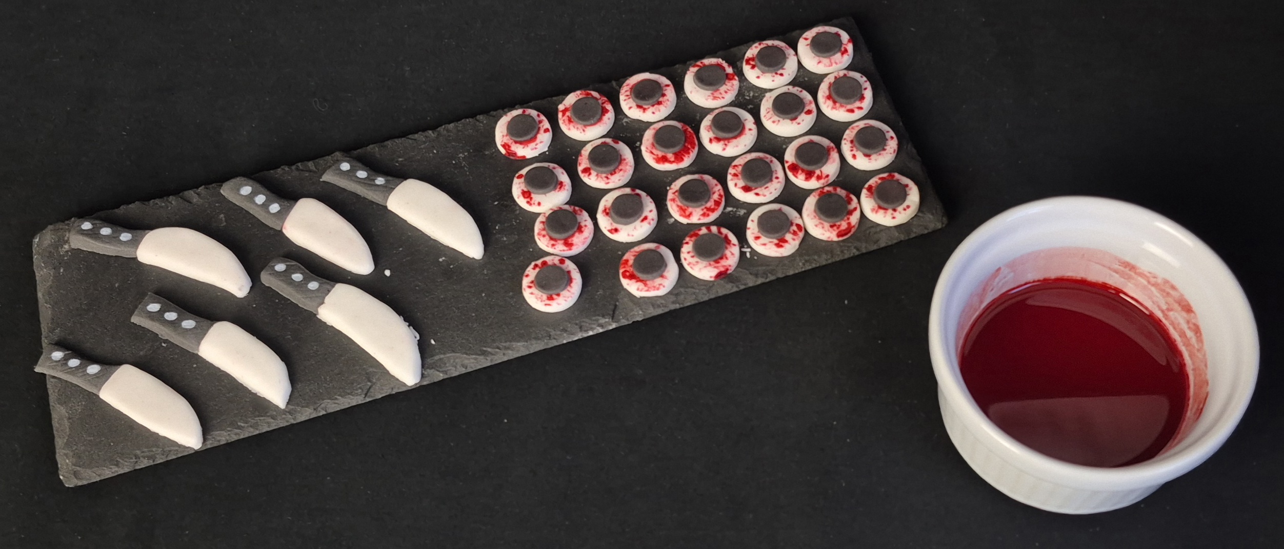 Aus dem Fondant kleine Augen und Messer modellieren. Den weißen Teil der Augen mit Hilfe von einem feinen Pinsel und etwas verdünnter roter Lebensmittelfarbe besprenkeln und gut trocknen lassen.