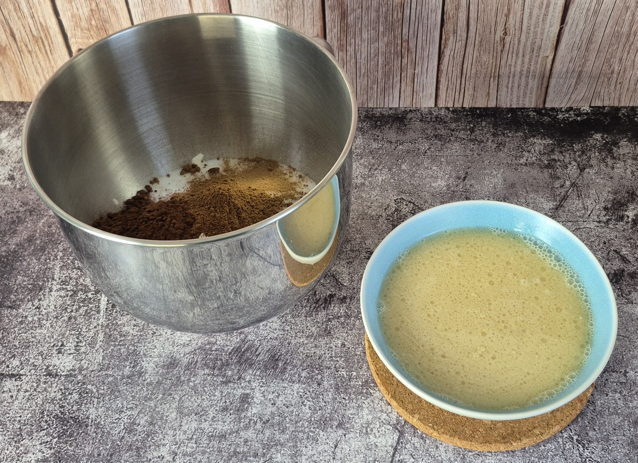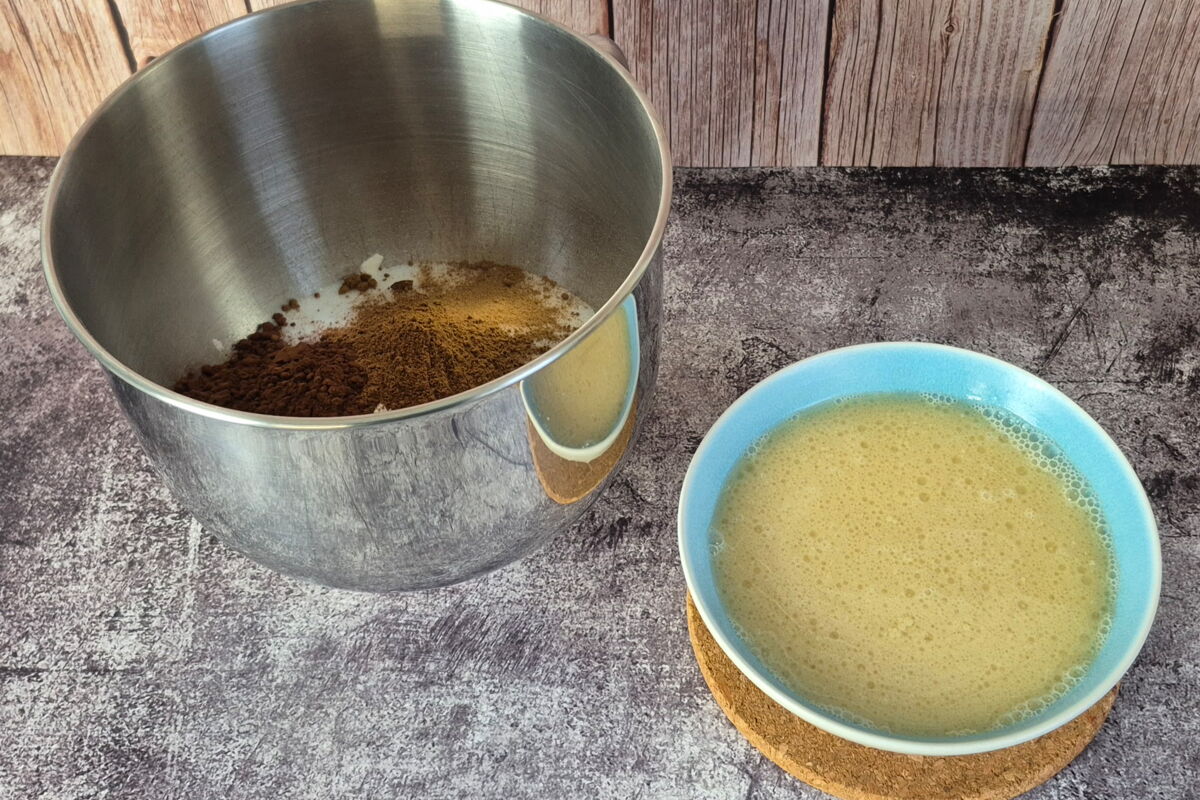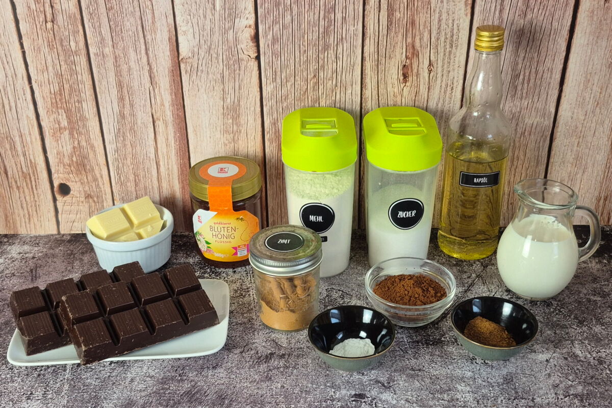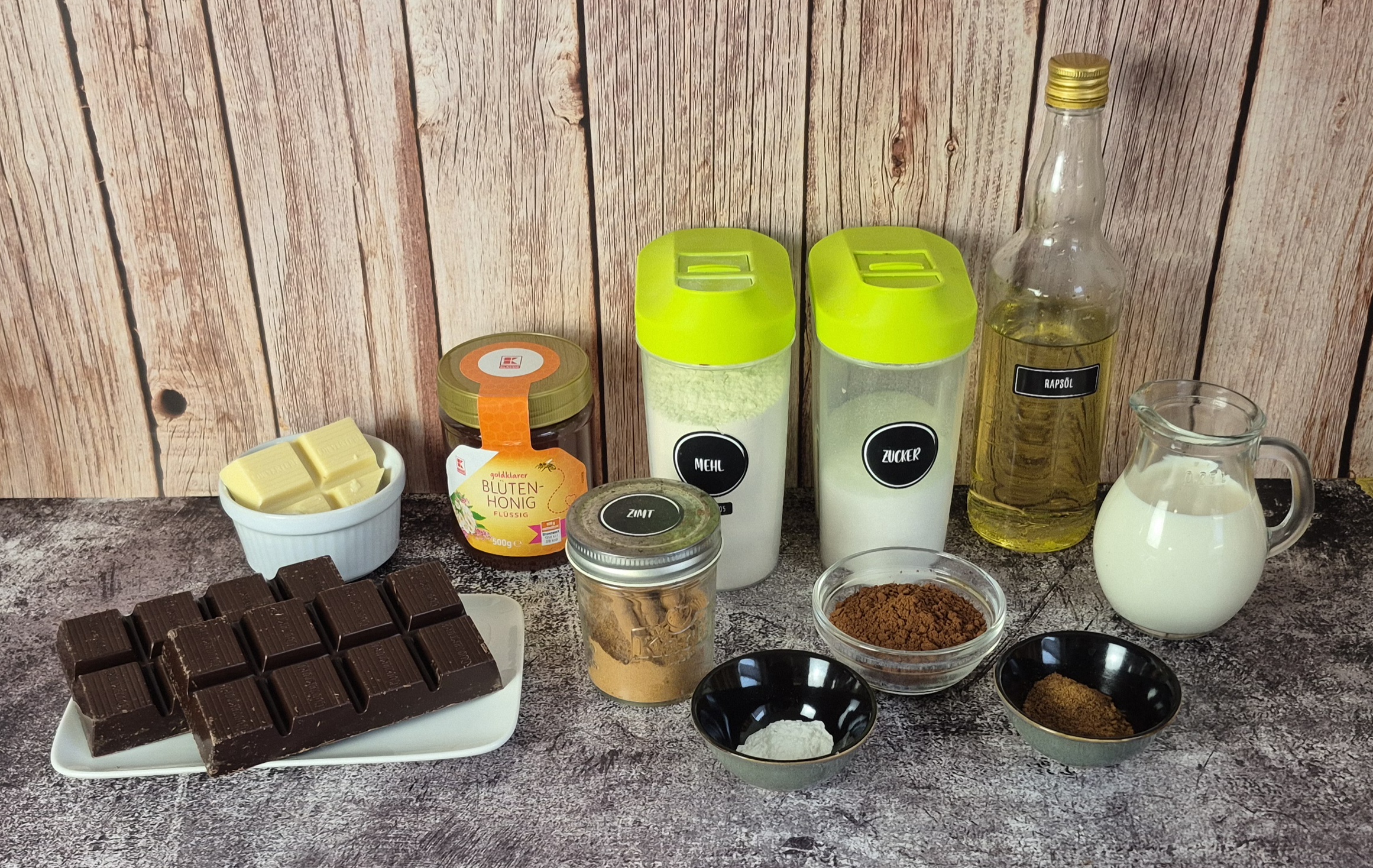 Für den Lebkuchenteig die Milch zusammen mit dem Honig in einem kleinen Topf erwärmen, bis der Honig sich vollständig aufgelöst hat. Währenddessen die trockenen Zutaten in einer weiteren Schüssel vermischen.