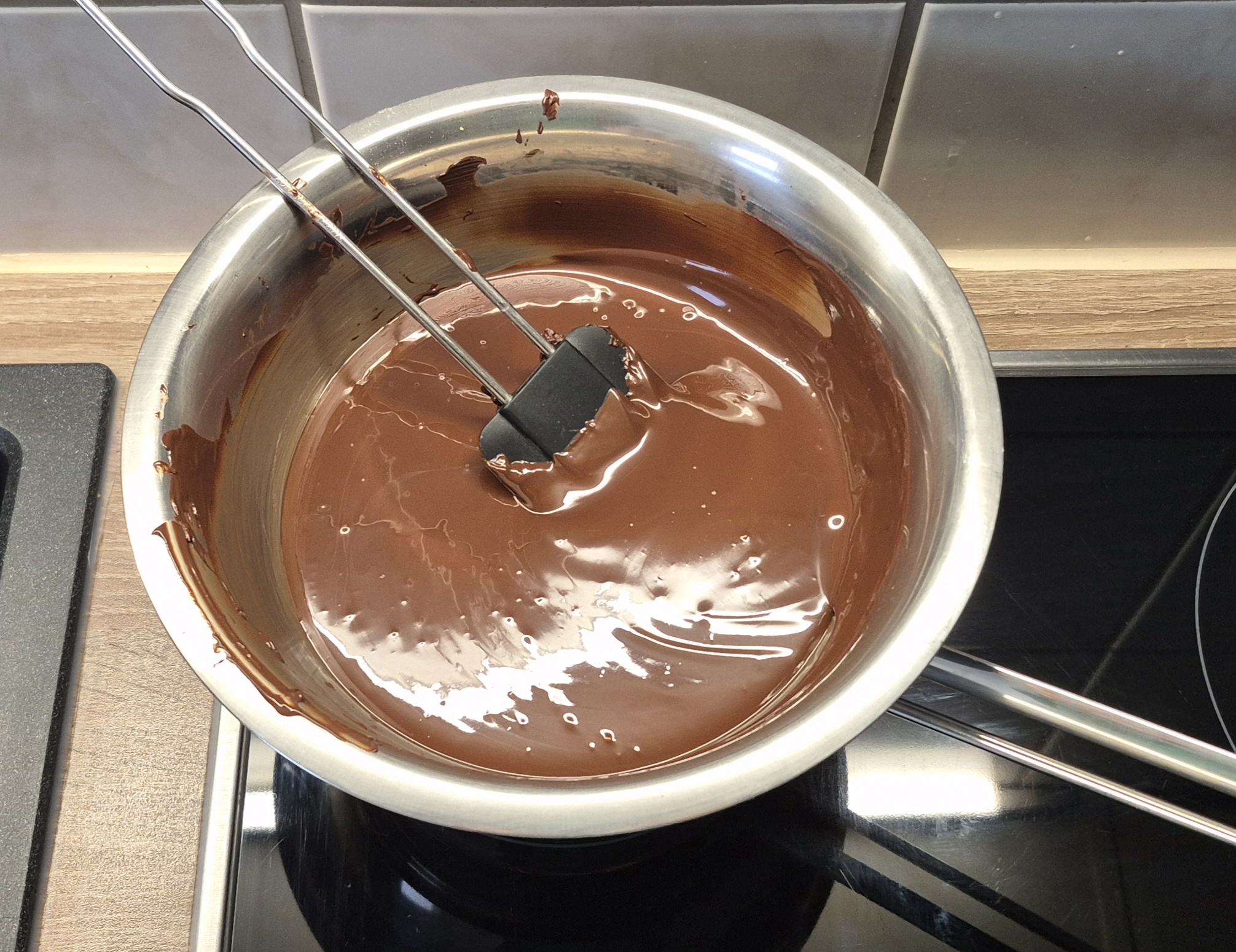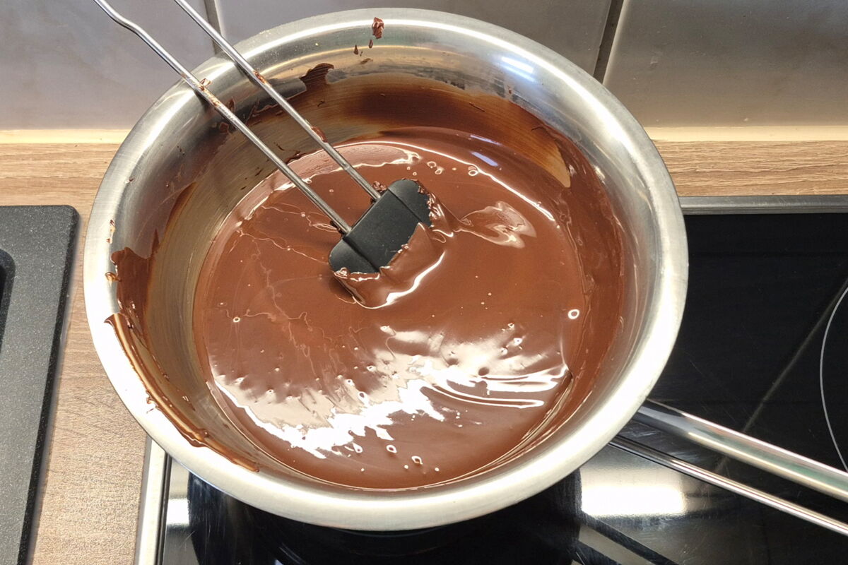 Nach der Backzeit die Lebkuchen vollständig auskühlen lassen. In der Zeit die beliebige Kuvertüre kleinhacken und ⅔ davon zusammen mit etwas Kokosfett über einem Wasserbad vorsichtig schmelzen lassen. Sobald die Kuvertüre fast geschmolzen ist den restlichen Drittel dazugeben und alles solange verrühren, bis sich alles aufgelöst hat.