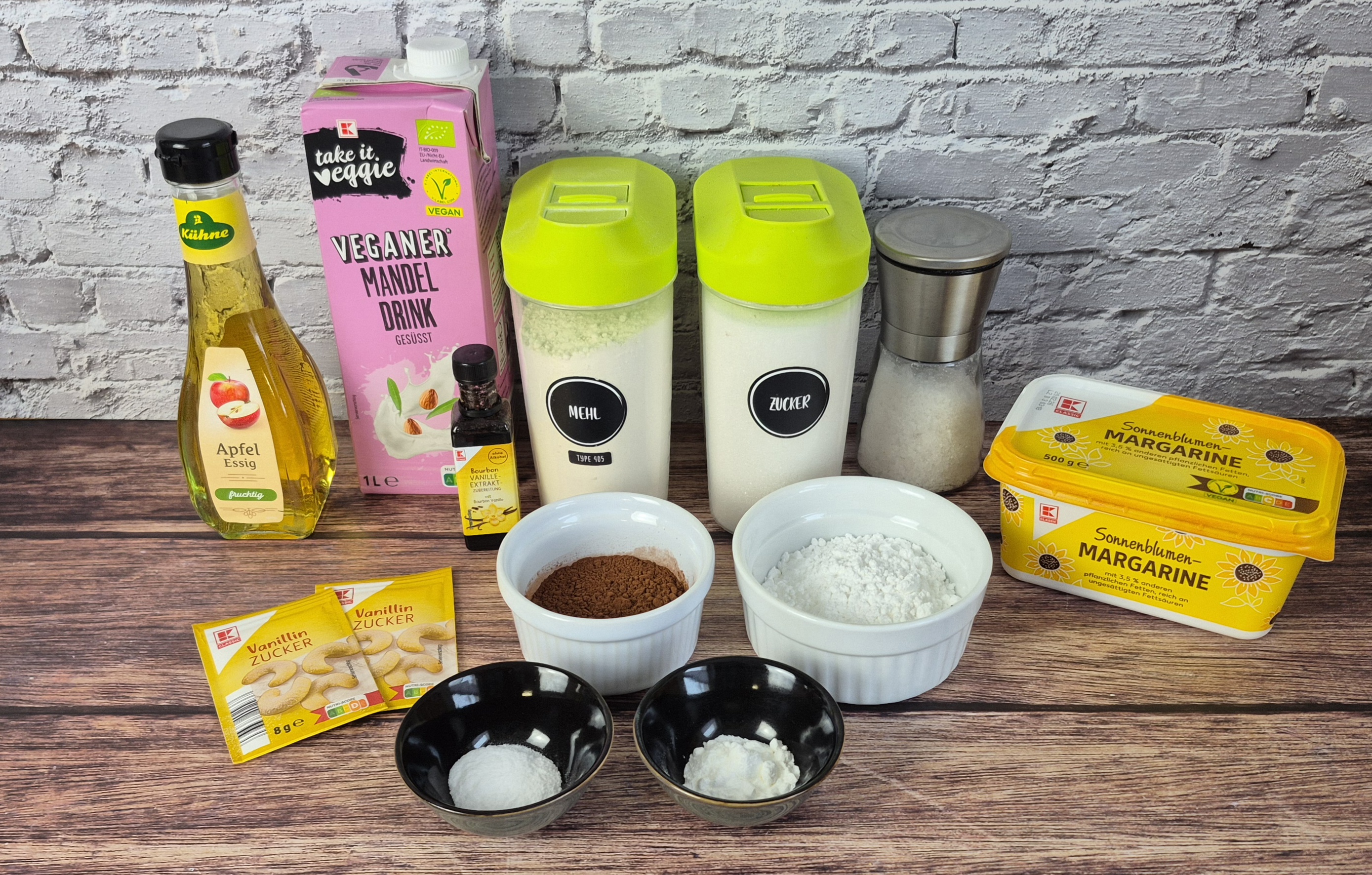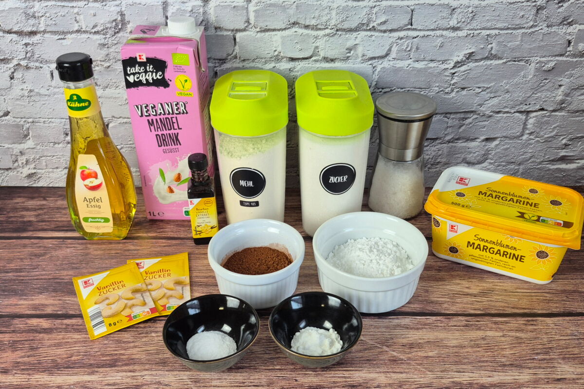 Zuerst den Backofen auf 170°C Umluft, anschließend den Apfelessig mit der Mandelmilch oder anderen pflanzlichen Alternative vermengen und für einige Minuten stehen lassen.