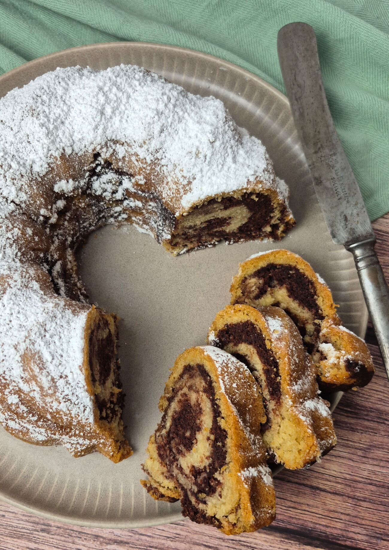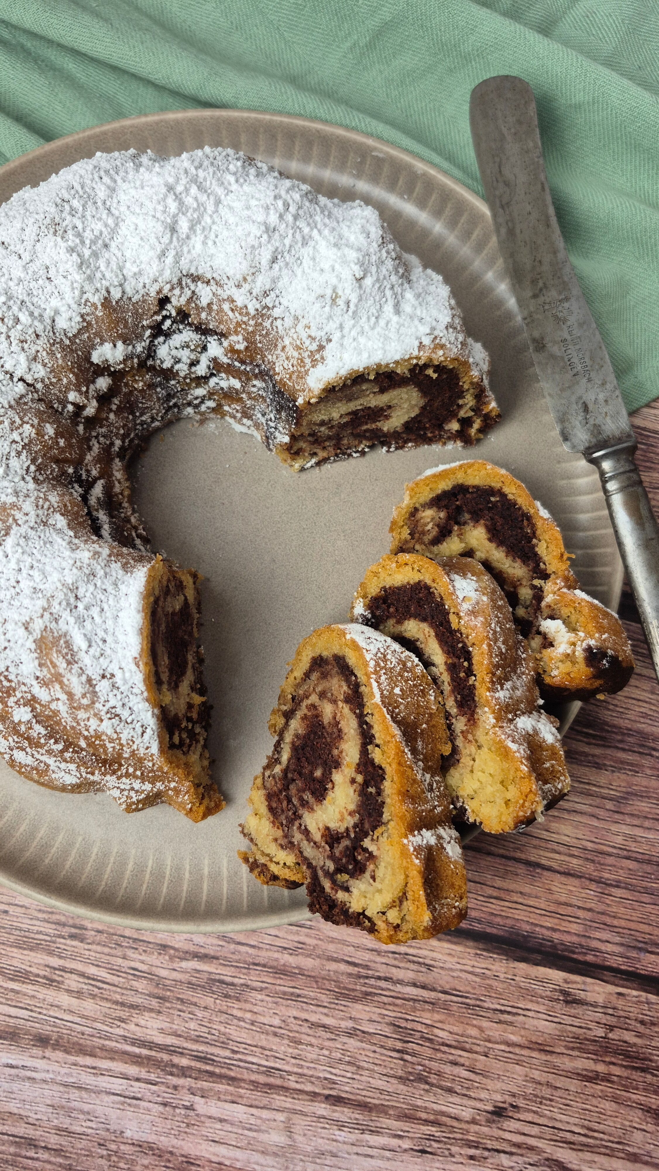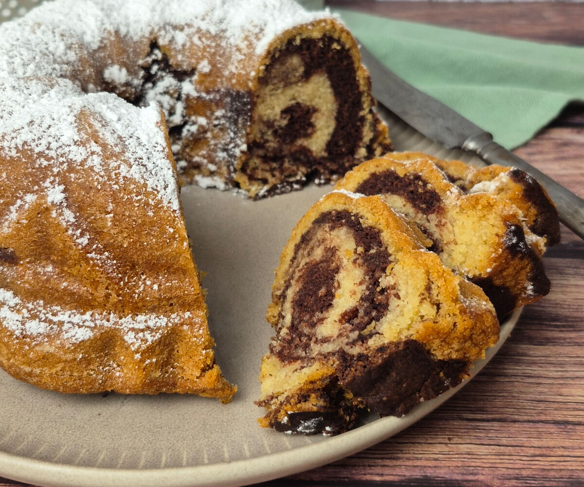 Sobald der Marmorkuchen abgekühlt ist, diesen noch mit etwas Puderzucker bestäuben und euren Liebsten servieren.