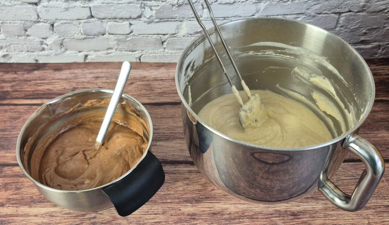 Danach den Rührteig auf zwei Schüsseln aufteilen und eine Hälfte davon mit den Backkakao vermengen.