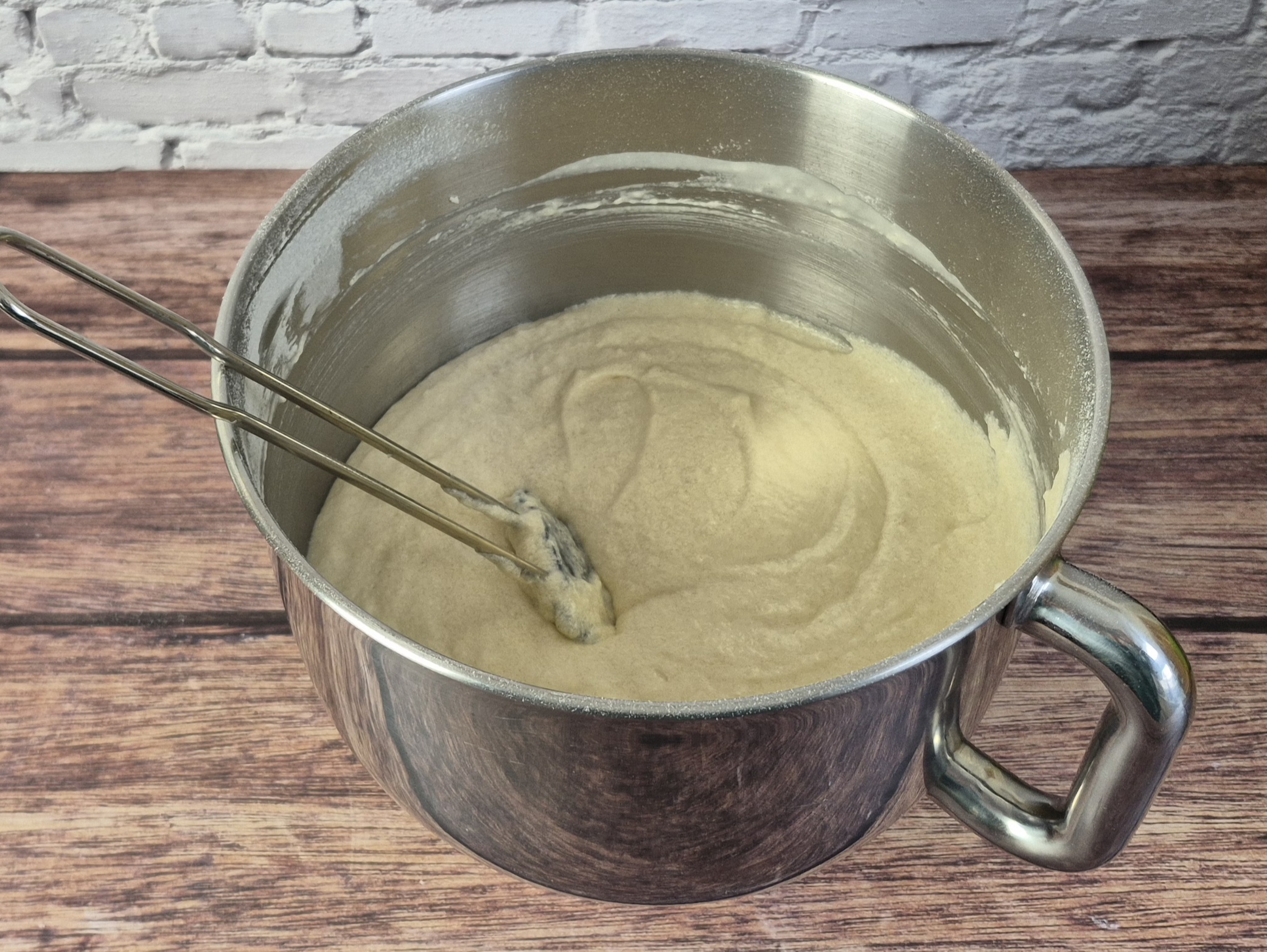 Die Mandelmilch dazugeben und alles vorsichtig per Hand verrühren, bis kein Mehl mehr zu sehen ist.
