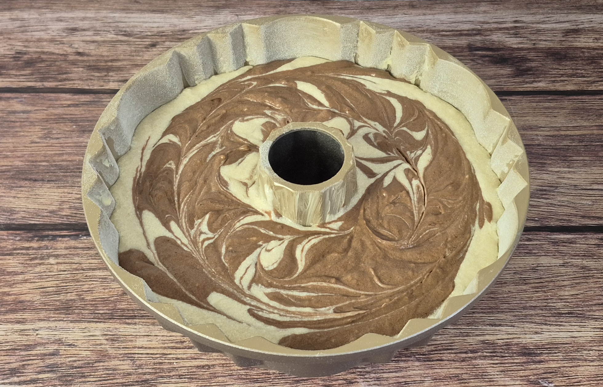TIPP: Du solltest mit dem Schokoladenteig beginnen, wenn du die Form mit Kakaopulver bestäubt hast, sonst mit dem Vanilleteig starten.