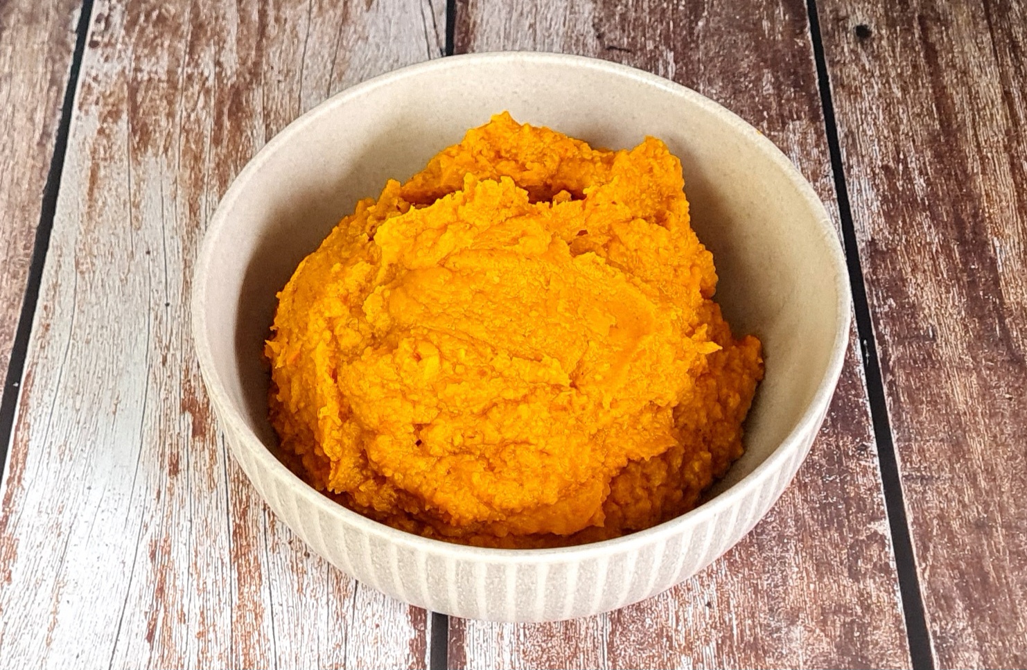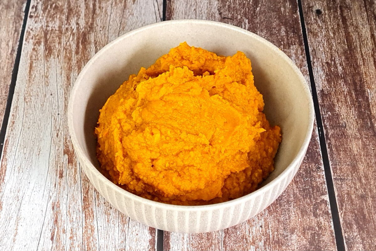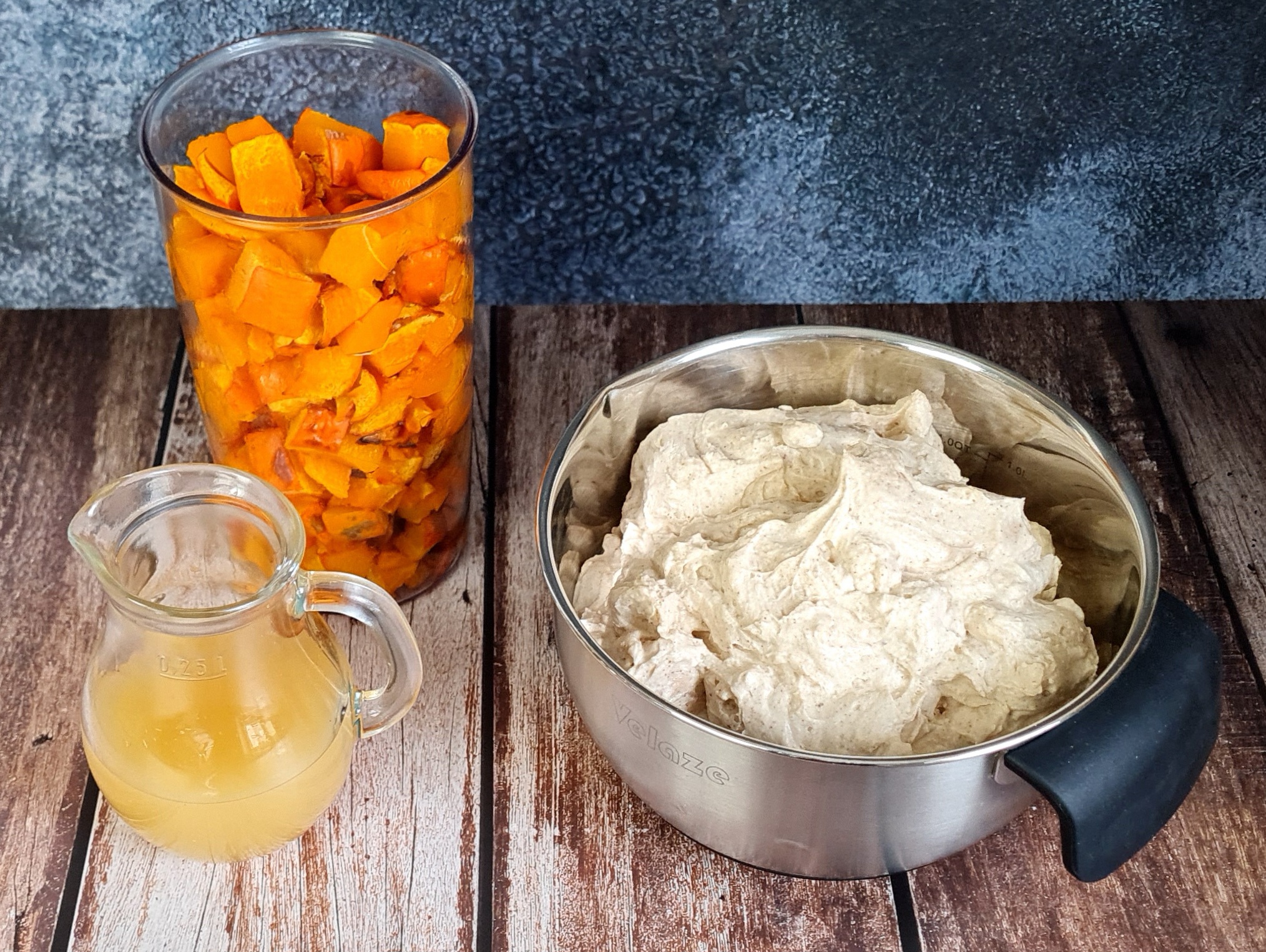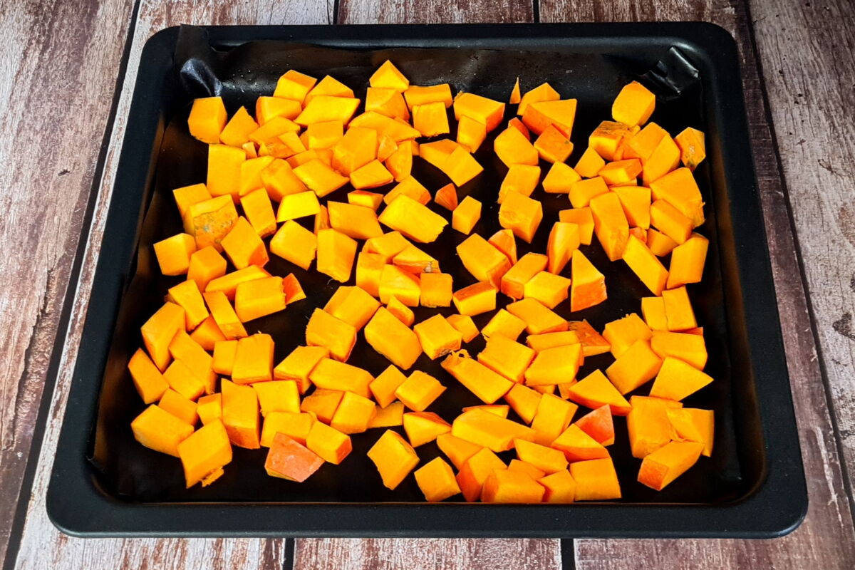 Für die Füllung zunächst den Kürbis waschen, halbieren und entkernen. Nun 400g vom Hokkaido kleinwürfeln, auf ein mit Backpapier ausgelegtes Backblech legen und im Backofen für 25 Minuten backen lassen, bis dieser weich genug ist um ihn im nächsten Schritt zusammen mit dem Apfelsaft fein zu pürieren.