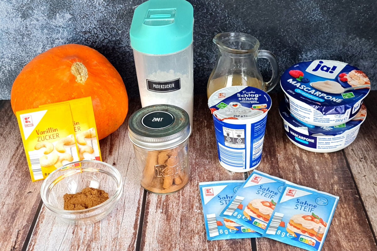 Anschließend die Mascarpone mit dem Puderzucker, Sahnesteif, den Gewürzen und dem Vanillezucker cremig schlagen. Die Schlagsahne seperat halbsteif aufschlagen und dann unter die Mascarpone heben. Nun ¼ der Mascarponecreme mit dem Kürbispüree vermischen und beide Cremes für die Weiterverarbeitung bereit stellen.