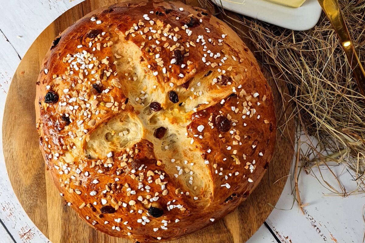 Dieses knusprig-samtige Hefebrot mit Mandeln und Rosinen ist super-einfach herzustellen und perfekt für euren Osterbrunch.