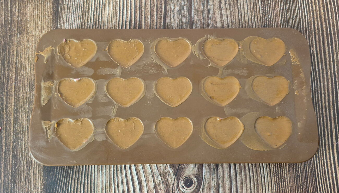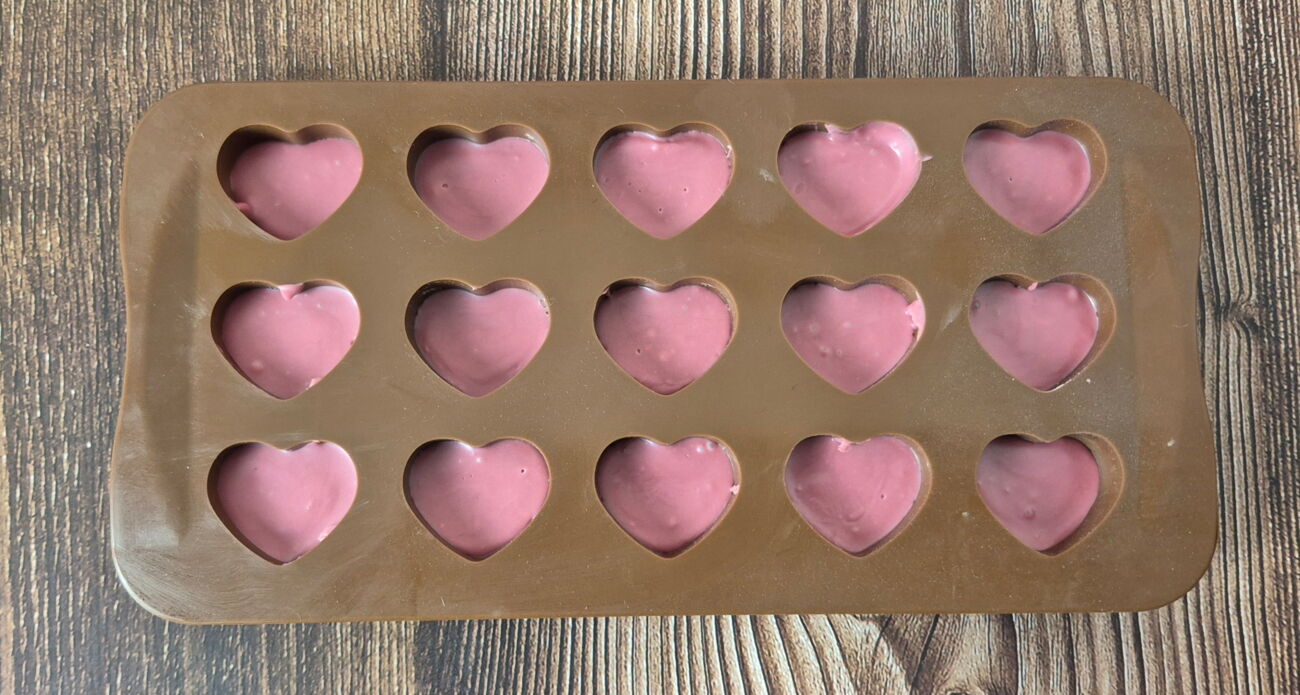 Im nächsten Schritt die Schokolade in einen Spritzbeutel geben und die Herzen der Silikonform zu je einem Viertel damit füllen.