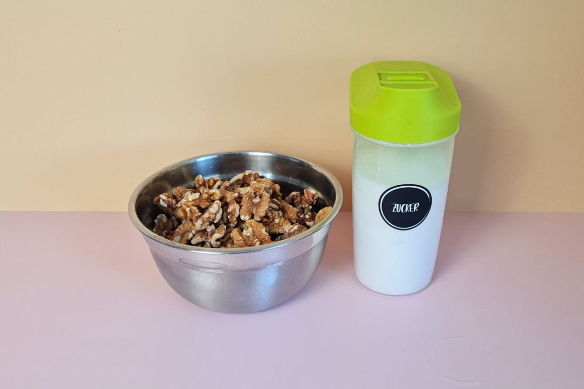 Den Zucker zusammen mit dem Wasser in einer Pfanne erhitzen, die Walnüsse dazugeben und solange rühren, bis das Wasser beginnt zu verdampfen und der Zucker sich um die Nüsse legt. Danach die Hitze reduzieren und ⅓ der Walnüsse zum Abkühlen auf ein Bogen Backpapier legen. Die restlichen Nüsse in der Pfanne weiter rösten (nicht anbrennen lassen!) , bis der Zucker beginnt wieder flüssig zu werden und zu karamellisieren. Dieser Prozess dauert etwa eine halbe Stunde.