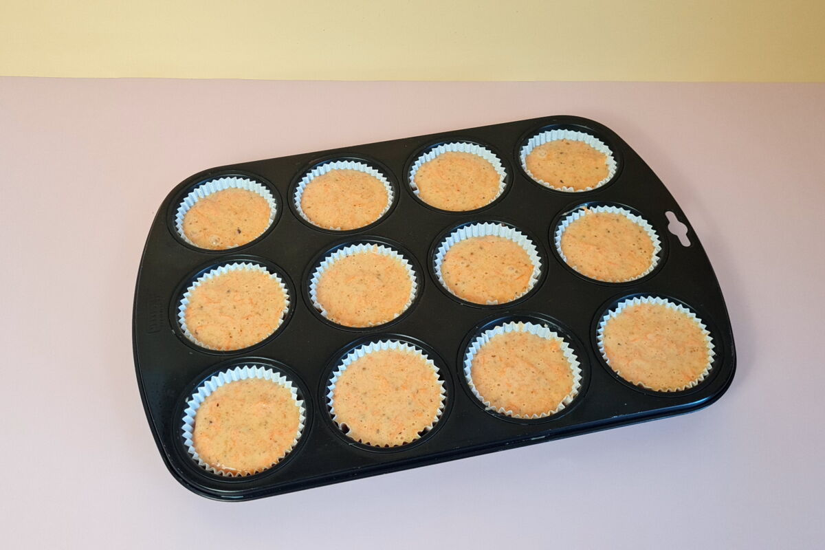 Zuerst ein Muffinblech mit Papierförmchen auslegen und den Backofen auf 160°C Umluft vorheizen.