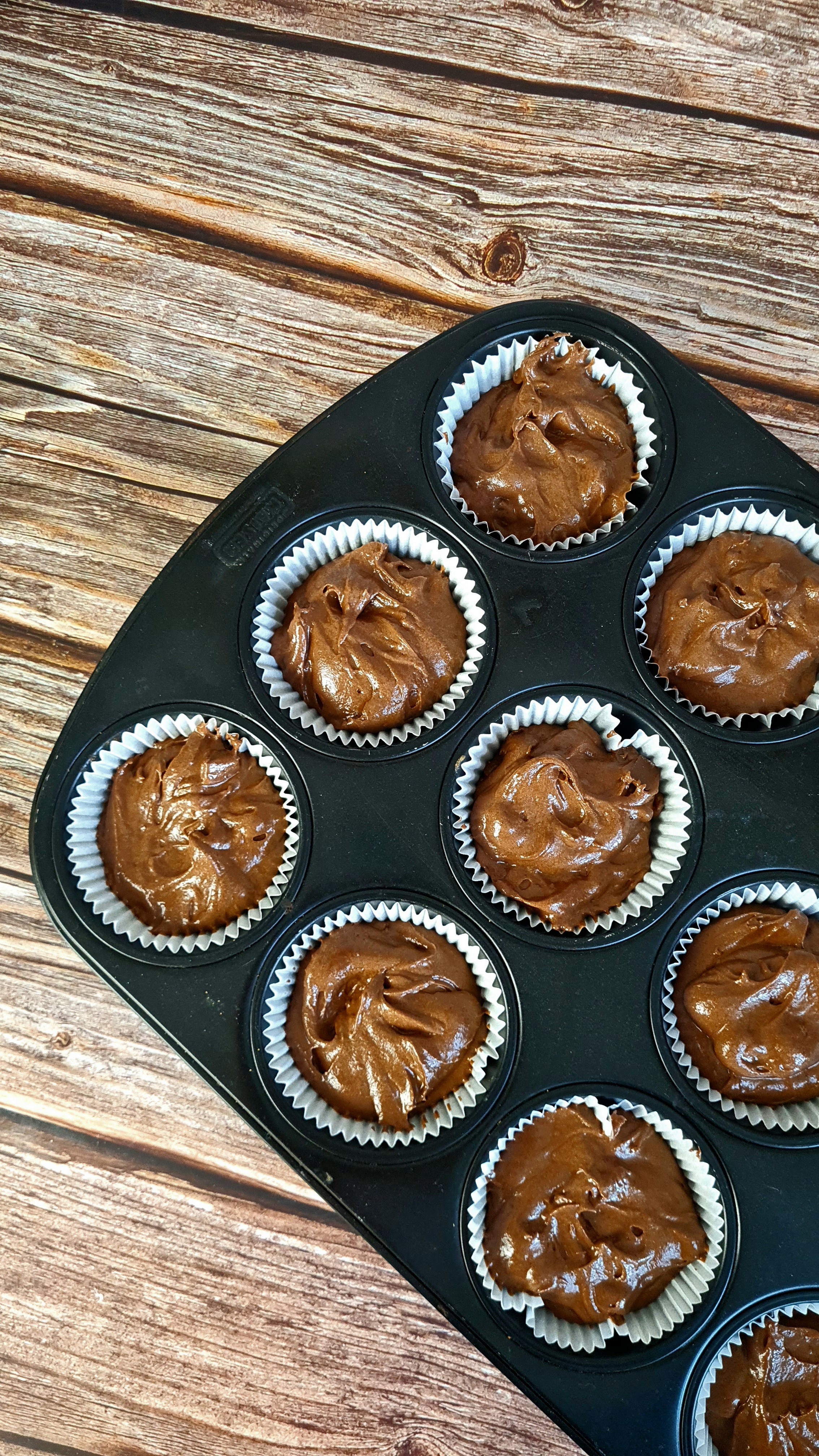 160°C Umluft vorheizen und ein Muffinblech mit Muffinförmchen auslegen.