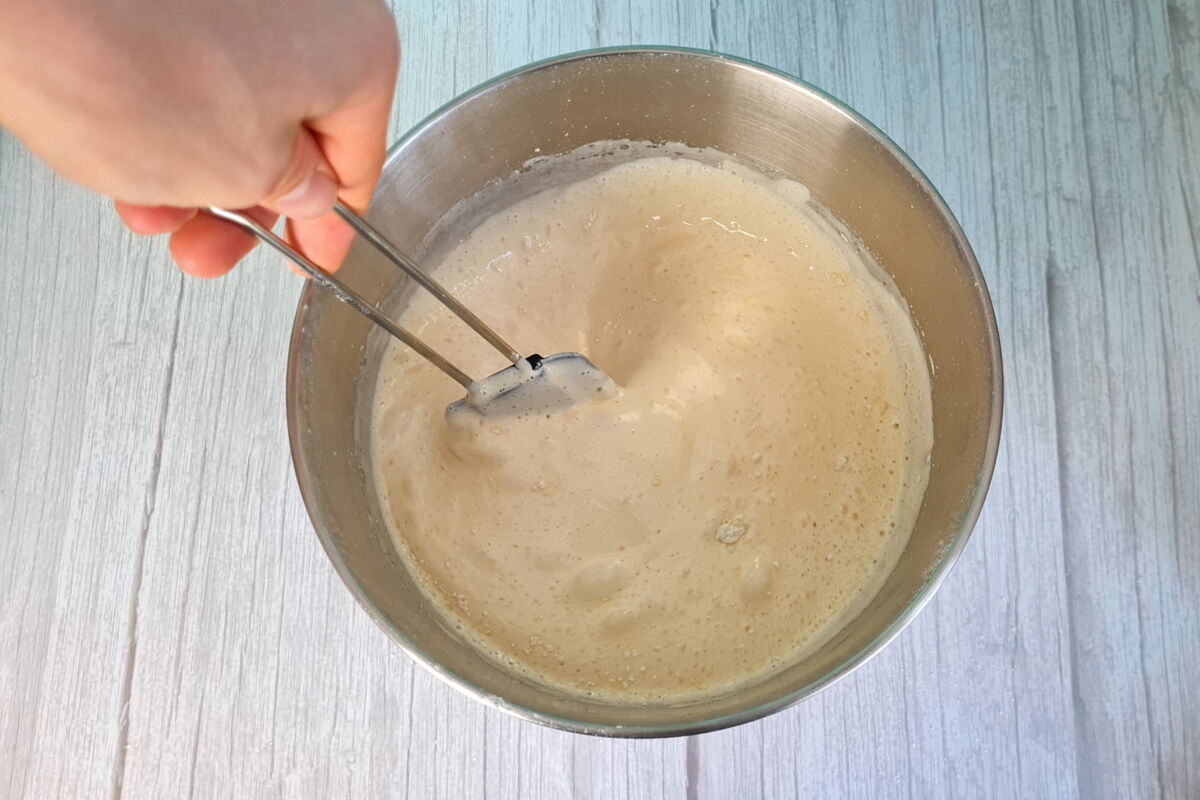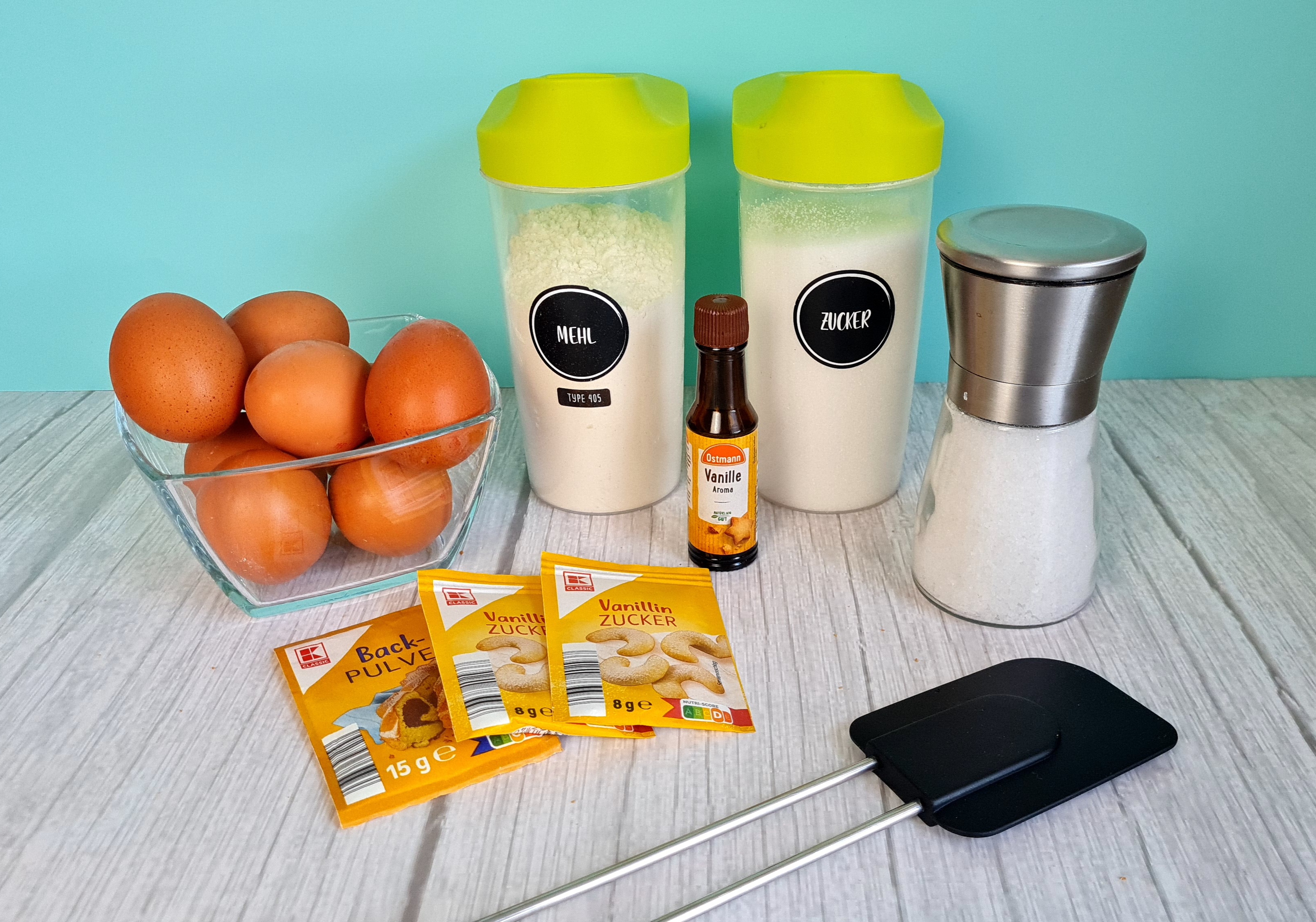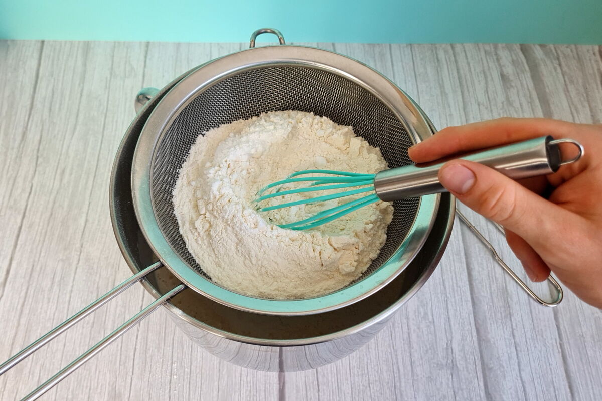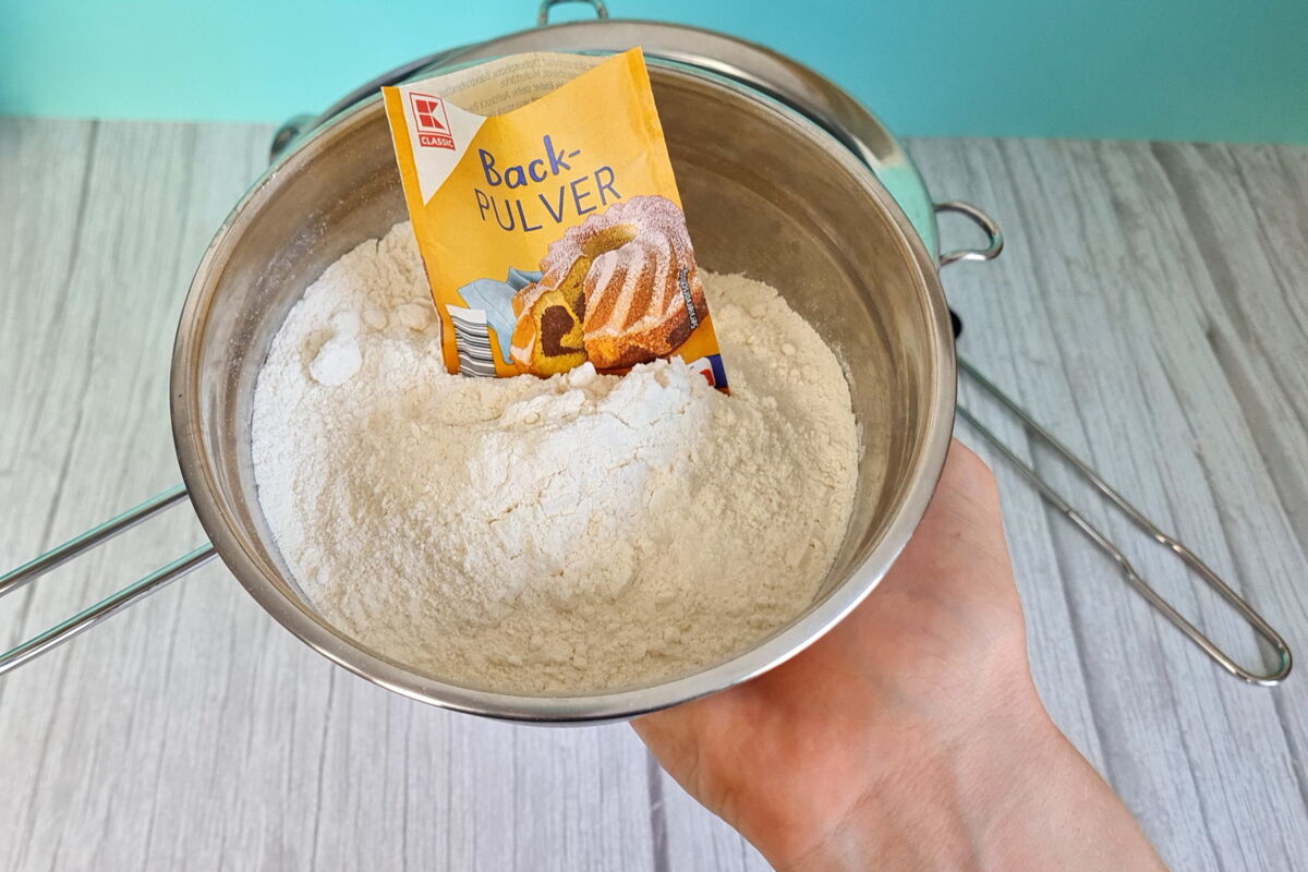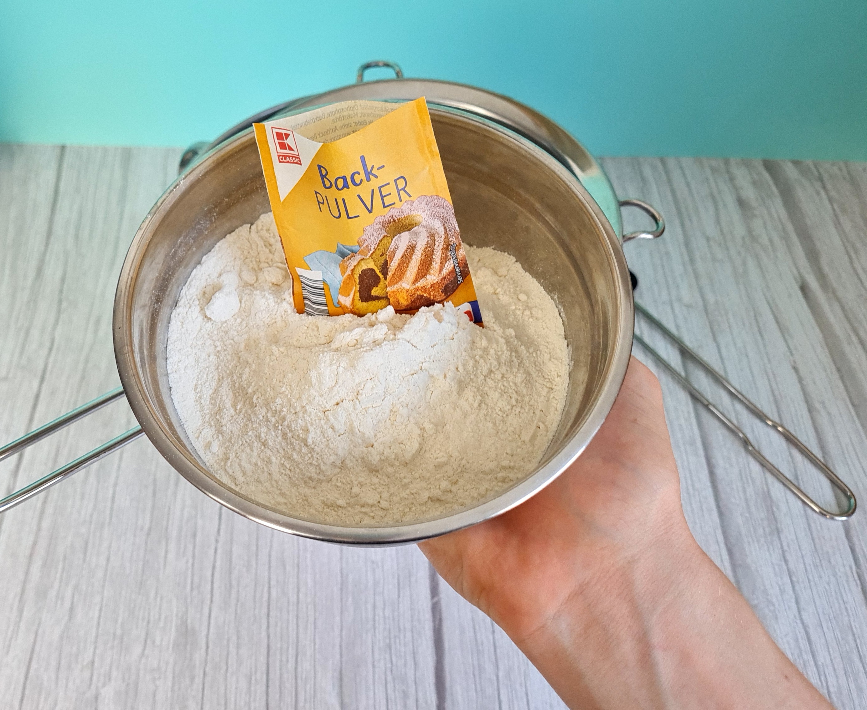 Währenddessen das Weizenmehl mit dem Backpulver in einer seperaten Schüssel sieben. Nun die trockenen Zutaten vorsichtig unter die fluffige Ei-Masse heben, ohne das zu viel Luft entweicht!