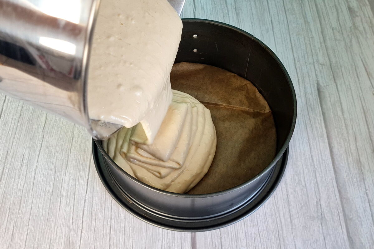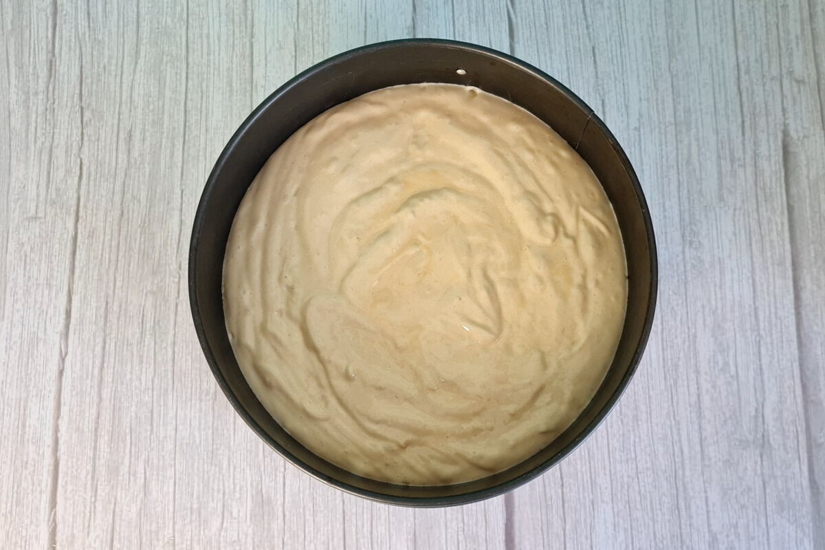 Den fertigen Biskuitteig in die vorbereitete Springform füllen und im vorgeheizten Backofen für etwa 30 Minuten backen lassen.