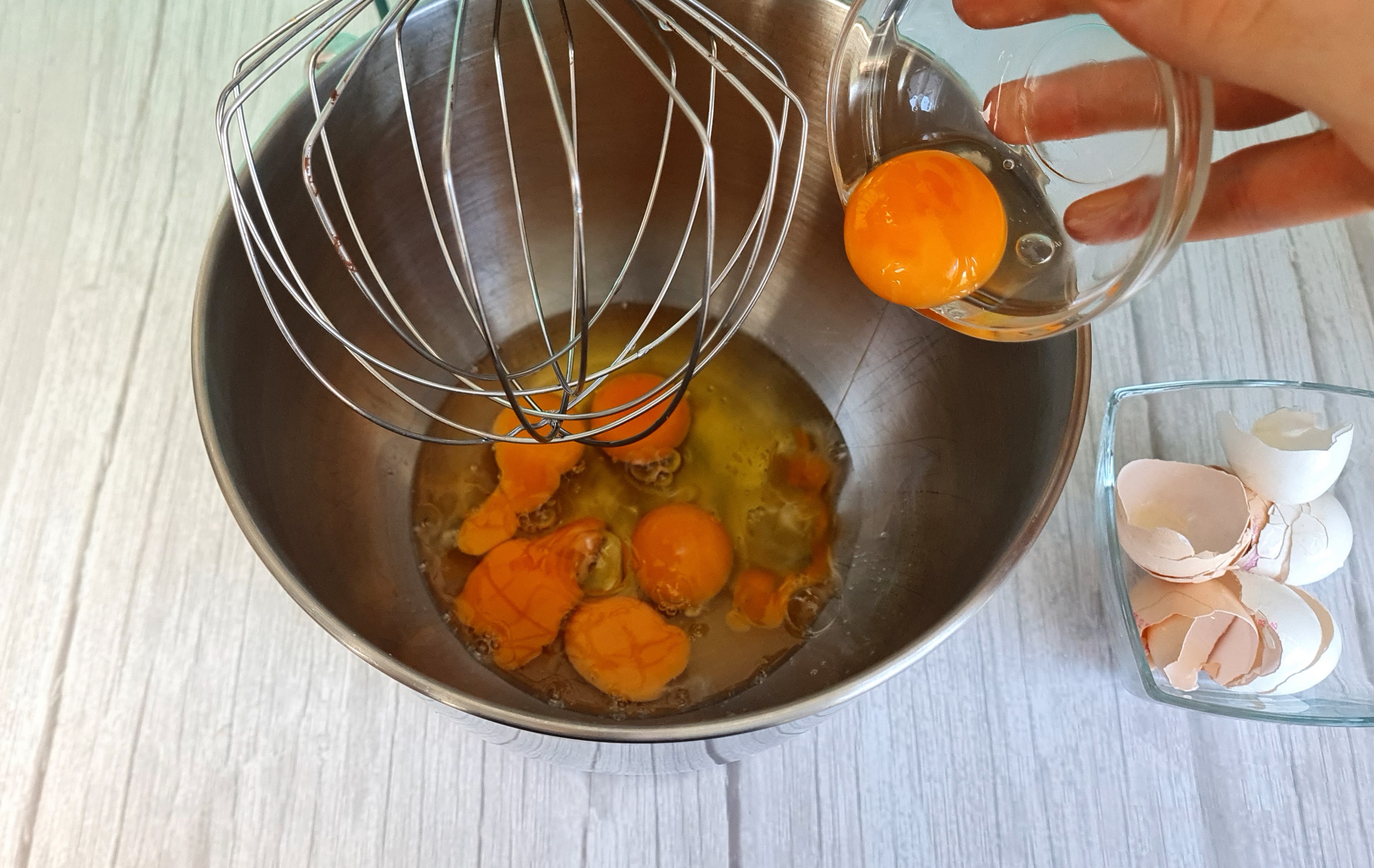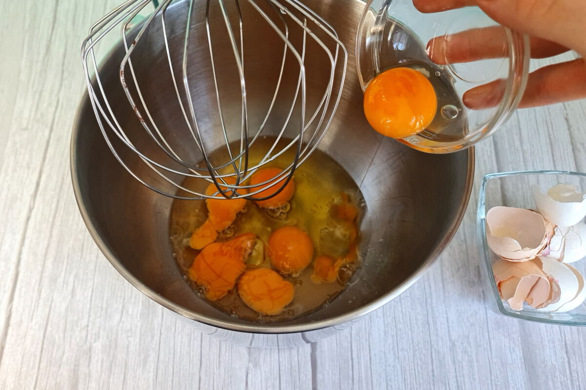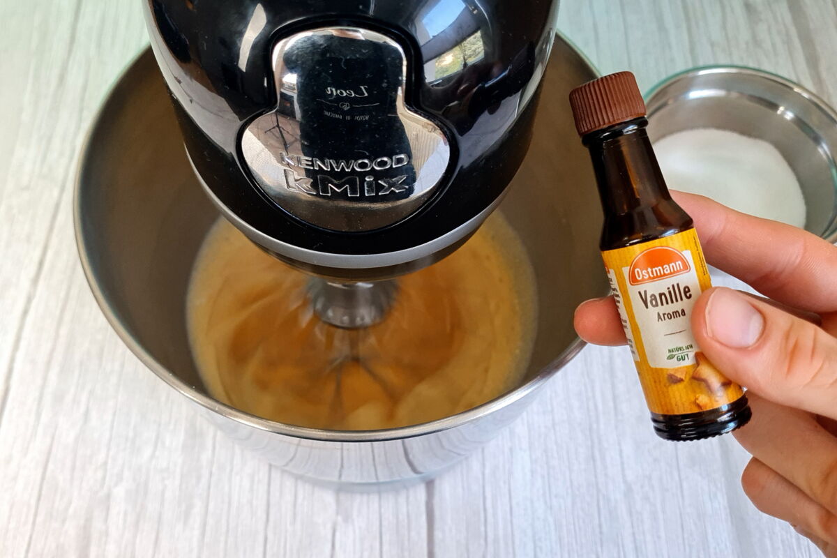 Für den Biskuitteig die Eier mit einer Prise Salz auf höchster Stufe aufschlagen und langsam den Zucker, den Vanillezucker und das Aroma nach und nach dazugeben. Das Ganze für ca. 12-15 Minuten dick cremig aufschlagen, bis sich das Volumen verdreifacht hat.