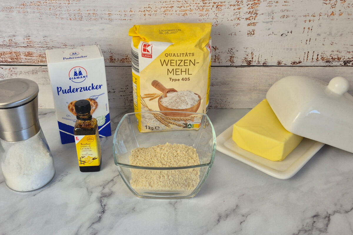 Für den Mürbeteig den Puderzucker in eine Schüssel sieben und zusammen mit den restlichen zu Streuseln verarbeiten.