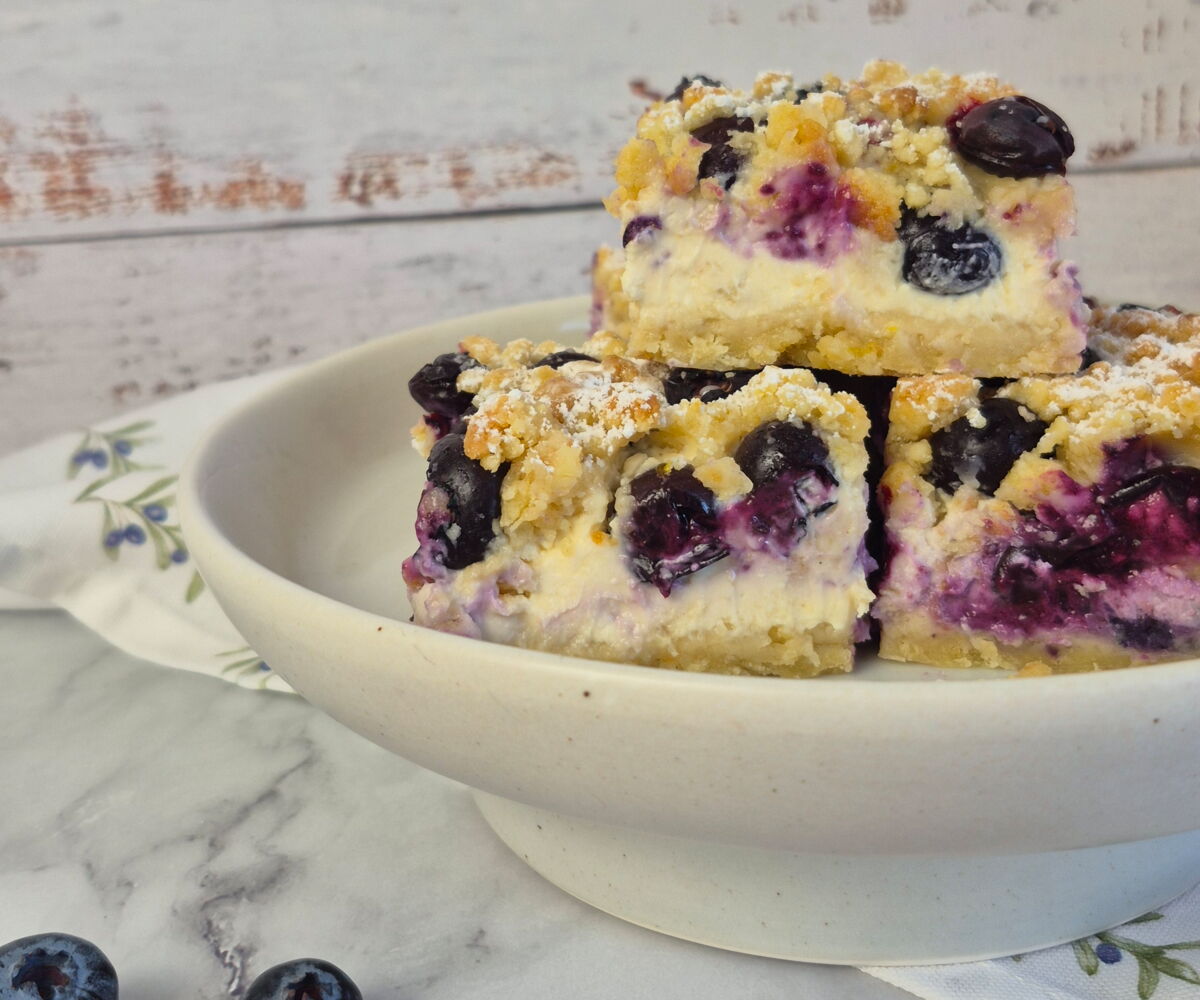 Vanille-Cheesecake-Schicht mit saftigen Blaubeeren und knusprigen Streuseln. Unglaublich lecker und super leicht zu machen.