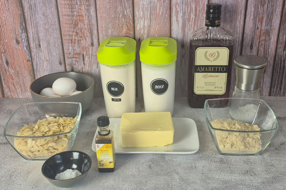 Für den Mandelbiskuit die weiche Butter mit den Zucker, etwas Vanillepaste und einer prise Salz hell cremig aufschlagen, bis der Zucker sich komplett aufgelöst hat. Währenddessen das Weizenmehl mit den gemahlenen Mandeln und dem Backpulver vermischen. Das Eiweiß sauber vom Eigelb trennen und die Eigelbe einzeln zur Butter-Zucker-Mischung geben. Danach die trockenen Zutaten und den Amaretto