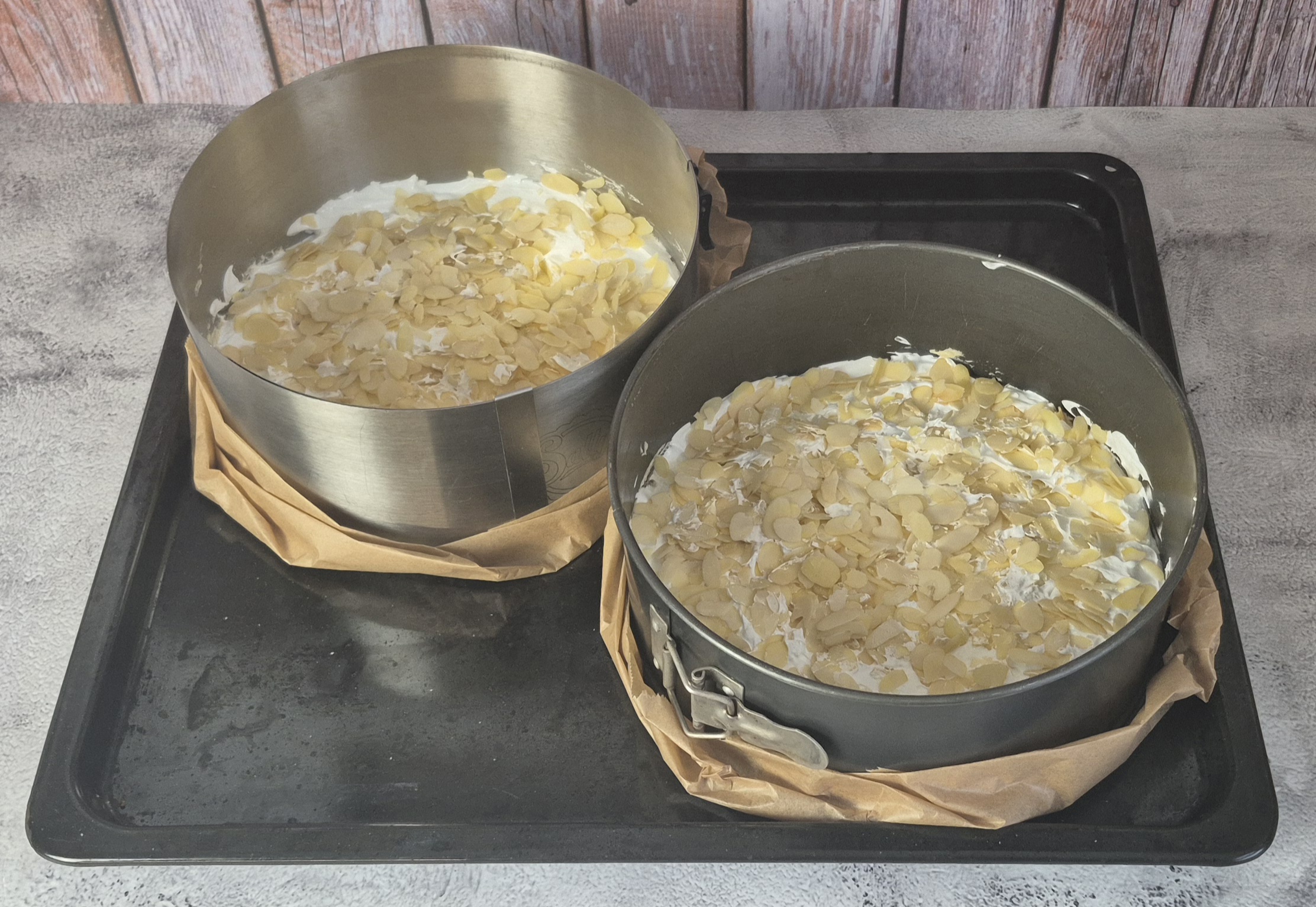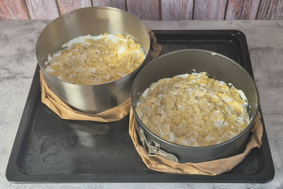 Wenn sich alle Zutaten verbunden haben und der Zucker sich aufgelöst hat, die Baisermasse auf dem schon aufgestrichenen Teig verteilen. Zum Schluss die Mandelblättchen oben aufstreuen und alles für etwa 35 Minuten im vorheizten Ofen backen.