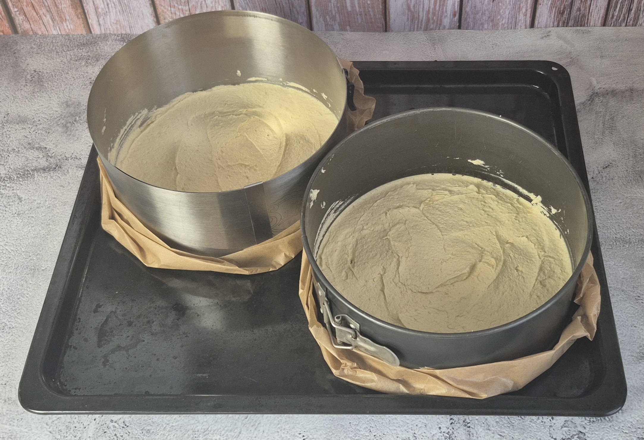 alternativ: Milch hinzugeben und alles zu einem geschmeidigen Teig verrühren. Den Teig gleichmäßig in dedn zwei vorbereiteten Springformen streichen und beiseite stellen.