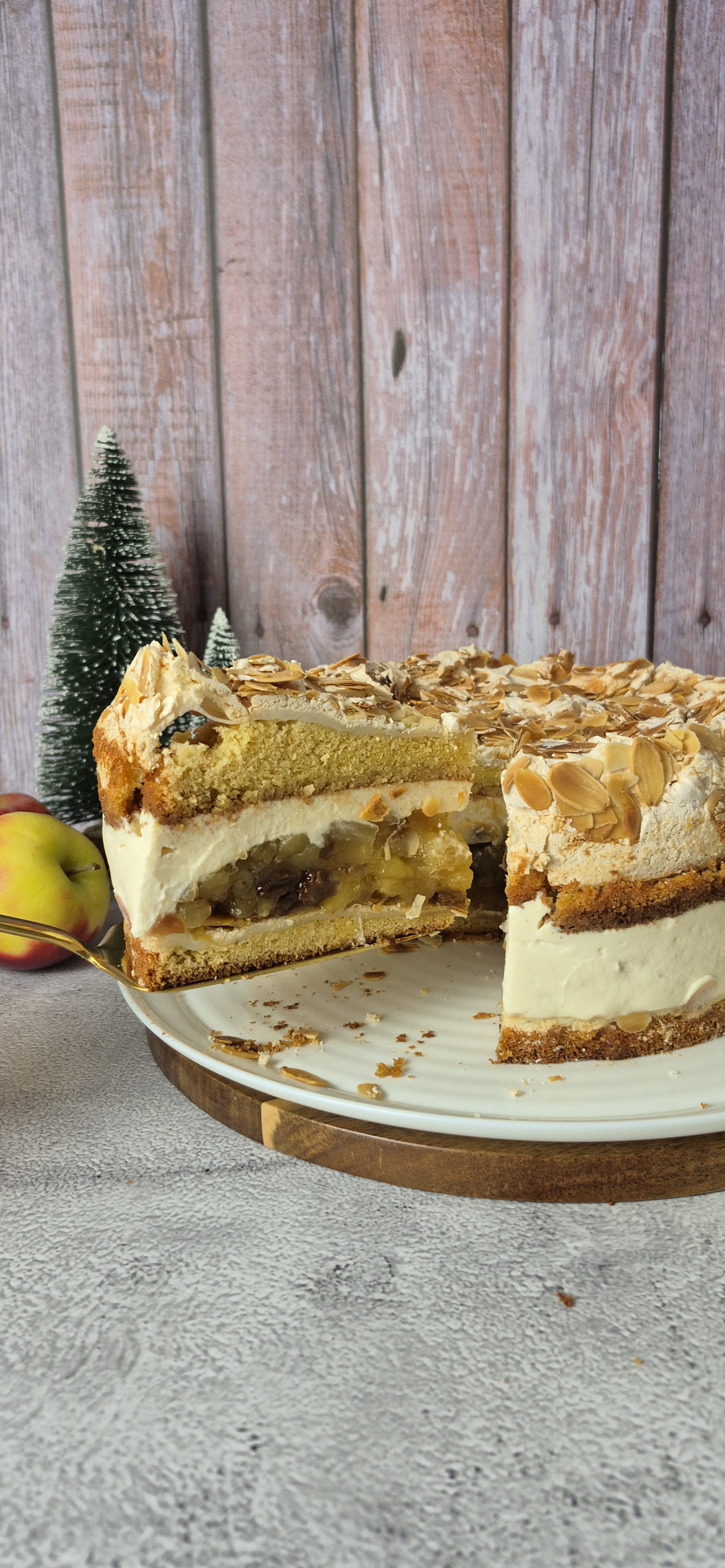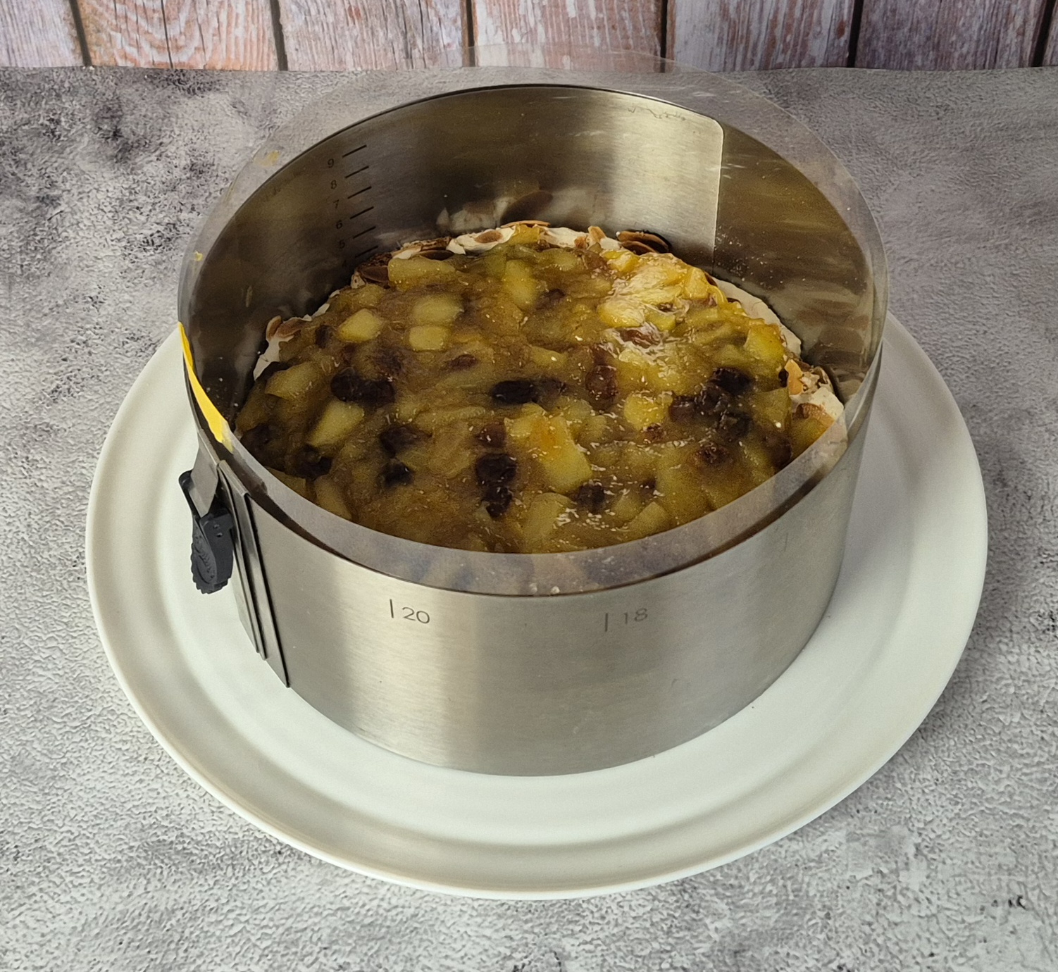 Den Tortenring mit Tortenrandfolie optional um einen Boden stellen und den Bratapfelkompott darauf verteilen, dabei einen aüßeren Rand von 1cm frei lassen. Im nächsten Schritt die Mascarpone-Schmand-Creme auf den Kompott geben und gleichmäßig verstreichen.