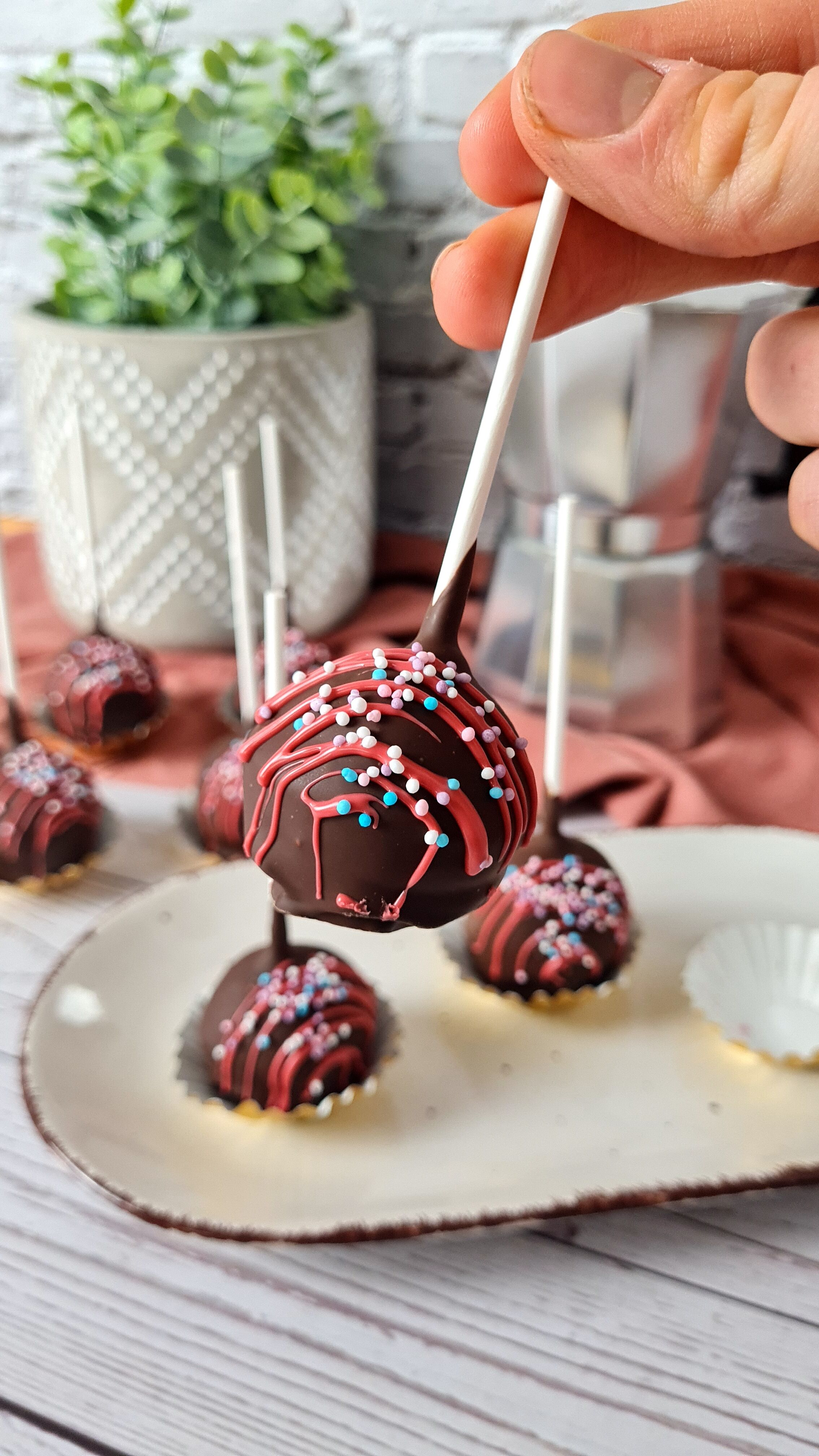 Zum Schluss die Kugeln nacheinander in die temperierte Kuvertüre tauchen, kurz abtropfen lassen und sofort nach belieben dekorieren. Hier sind deine Kreativität gar keine Grenzen gesetzt. Den fertigen Cake Pop danach zum Trocknen wieder in den Styropor-Block stecken.