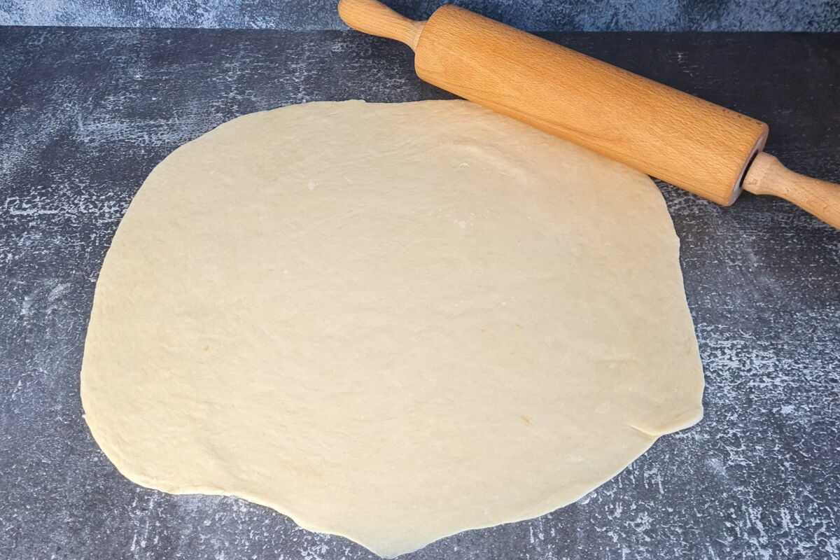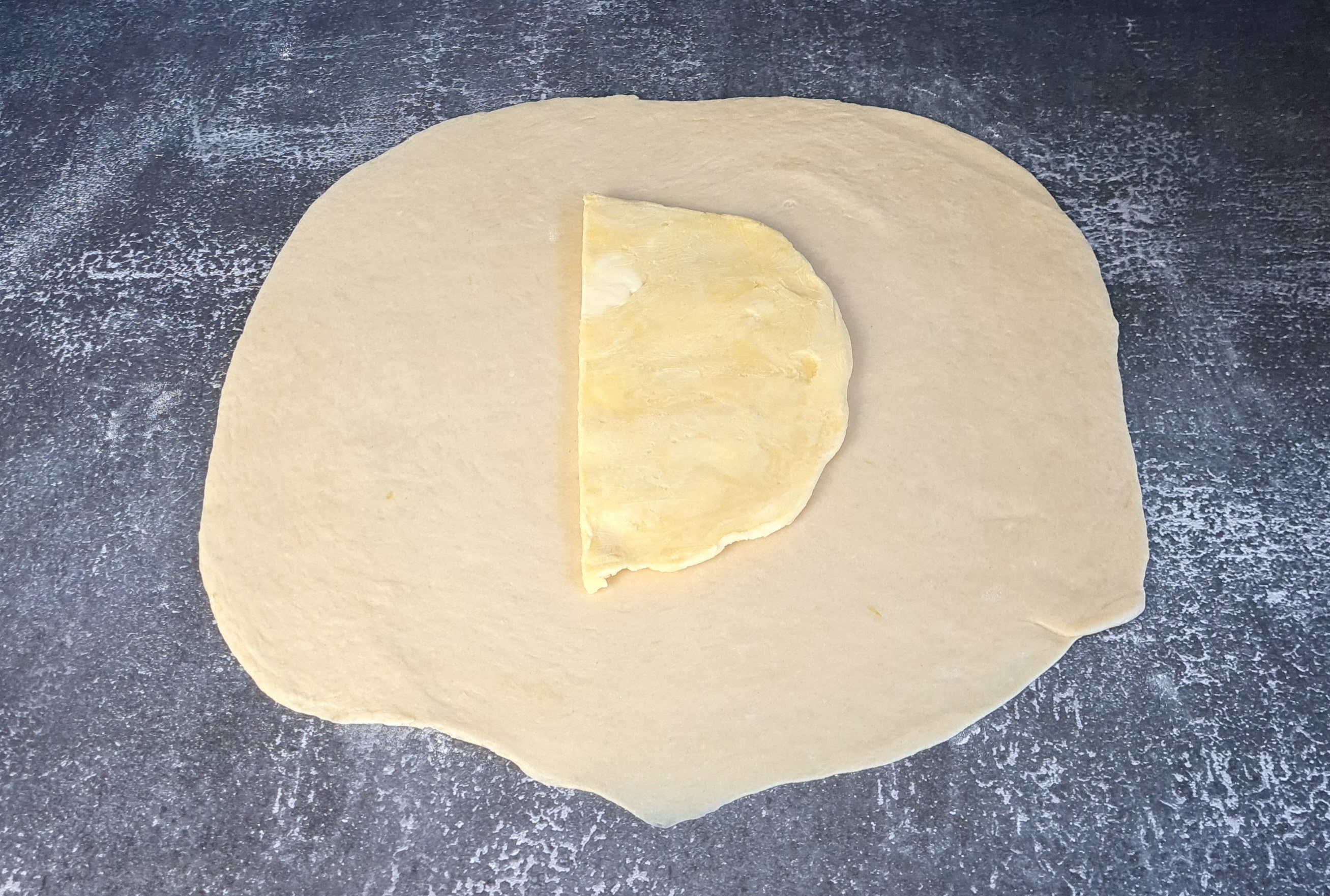 Im nächsten Schritt den Backofen auf 190°C Ober-/Unterhitze vorheizen und das Backblech mit Backpapier auslegen. Die Arbeitsfläche mit etwas Weizenmehl bestäuben, den gekühlten Teig ausrollen und die vorbereitete Butterplatte (Ziehbutter) darin einschlagen.