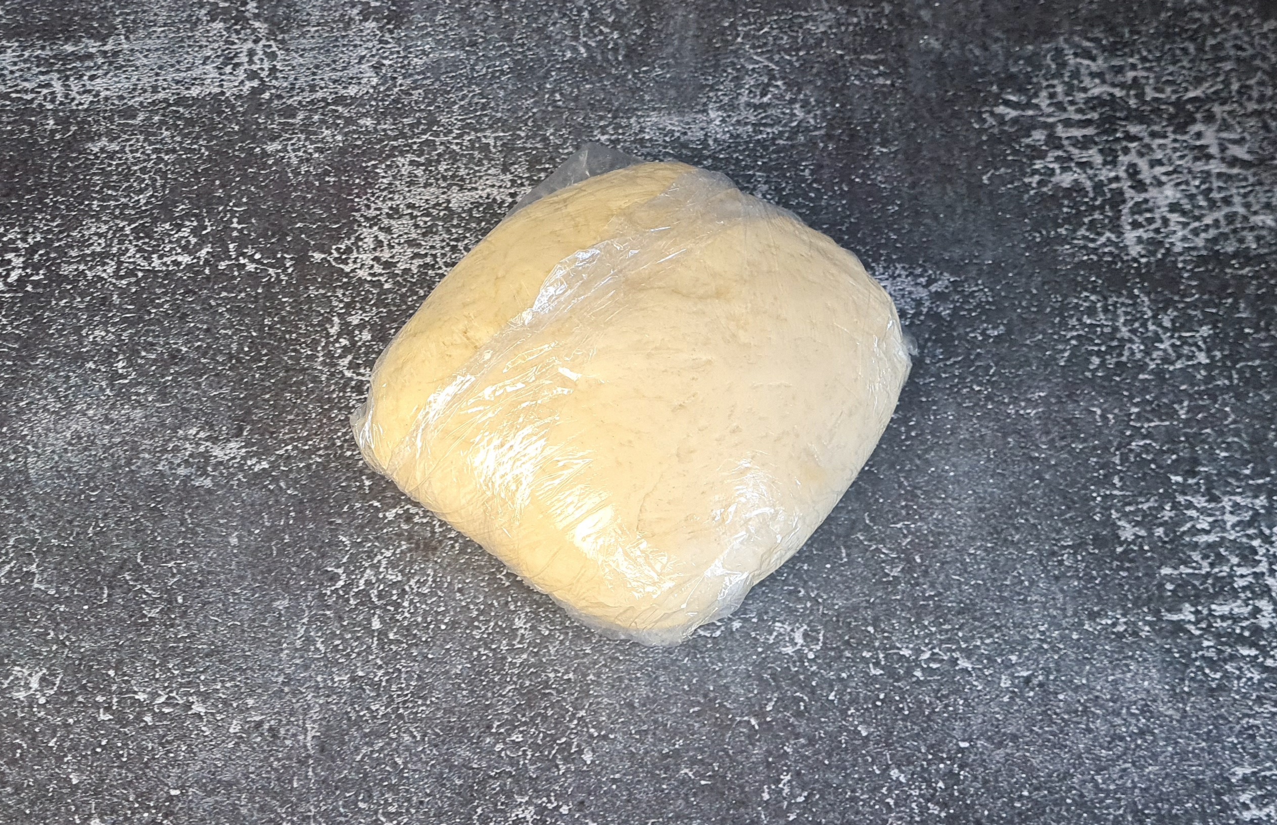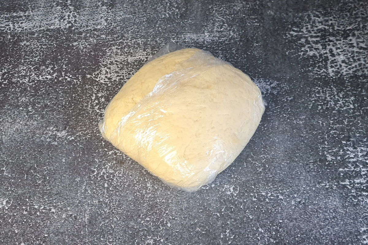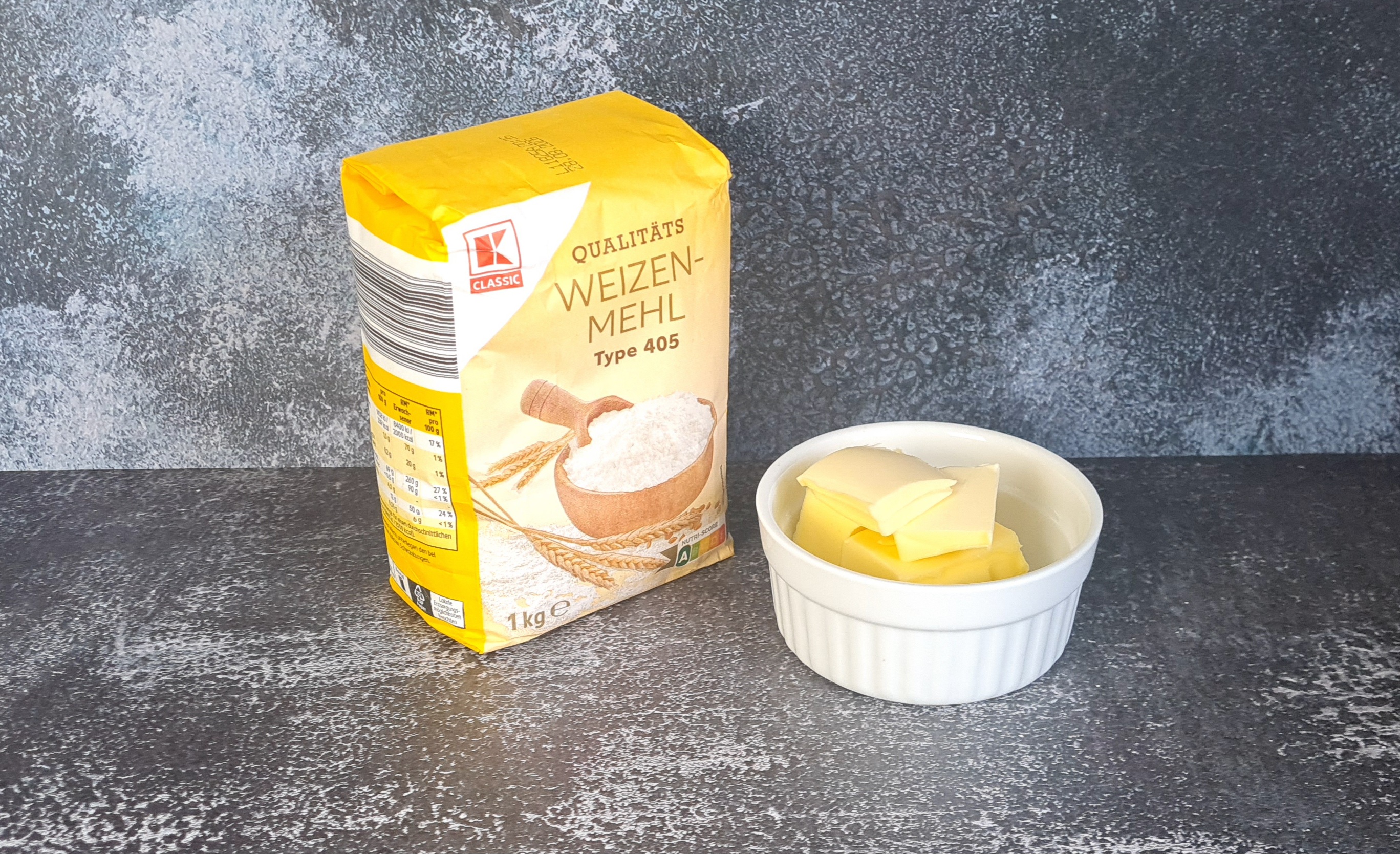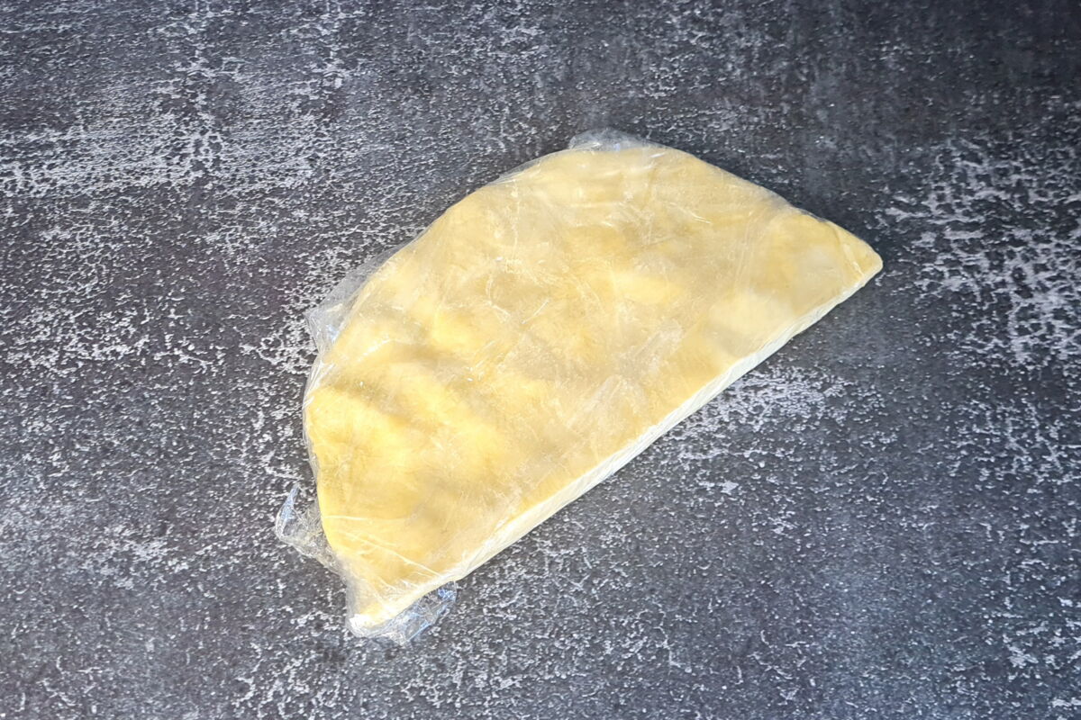 Zuerst die kalte Butter mit dem Weizenmehl verkneten und glattarbeiten. Anschließend die Ziehbutter zu einer rechteckigen Platte ausrollen und foliert in den Kühlschrank legen.