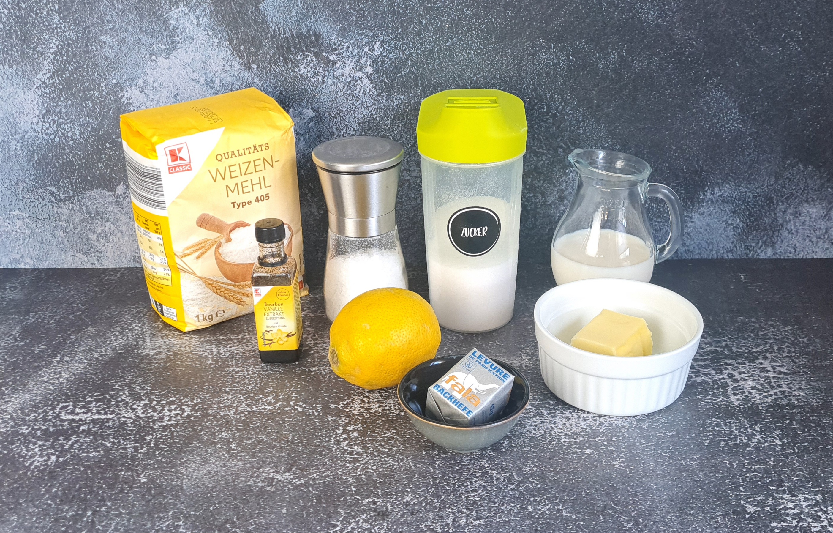 Für den Teig das Weizenmehl zusammen mit der frischen Hefe, Milch und dem Zucker zu einem Vorteig kneten und etwa 10 Minuten foliert ruhen lassen. Danach die restlichen Zutaten mit dem Vorteig glatt kneten, zu einer Kugel formen und foliert für etwa 15 Minuten in den Kühlschrank legen.