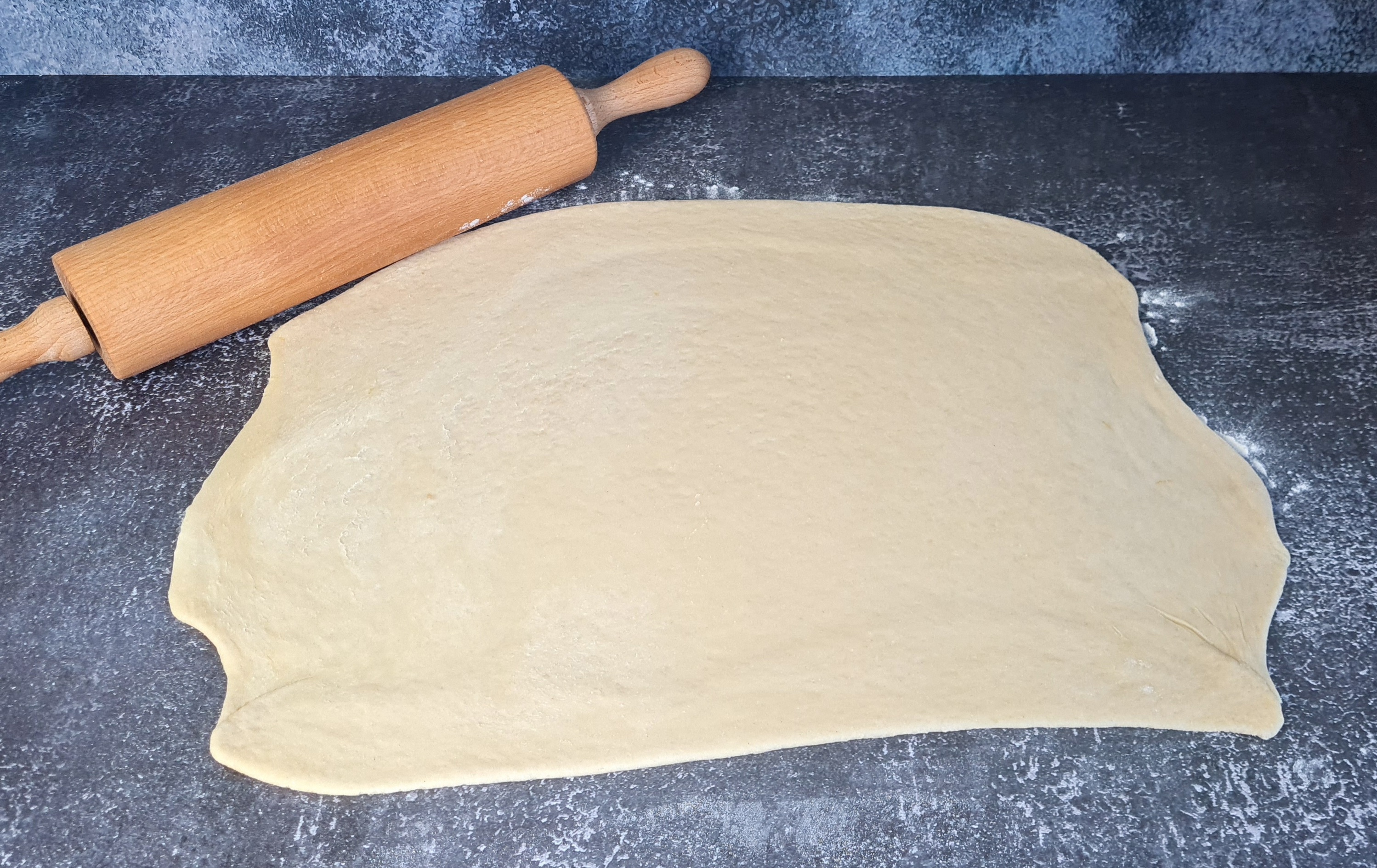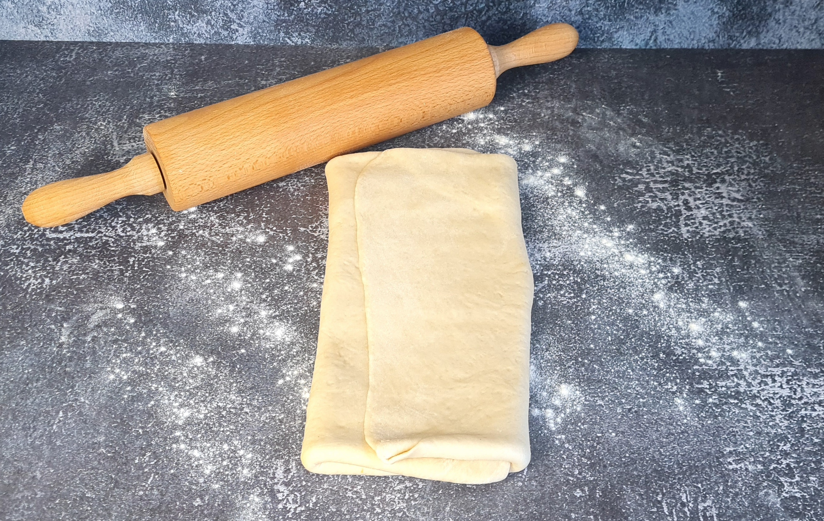 Nun bekommt der Plunderteig zwei einfache Touren: Den Teig zu einem länglichen Rechteck ausrollen, auf ⅓ der Fläche ineinander falten, sodass drei Teigschichten übereinander liegen. Anschließend foliert für 10 Minuten im Kühlschrank ruhen lassen. Danach den Teig um 90 Grad drehen, noch einmal zu einem Rechteck ausrollen und die zweite einfache Tour geben. Nochmals für etwa 10 Minuten foliert kühlen. Im Anschluss den Teig auf einer bemehlten Fläche auf 45x30cm ausrollen.