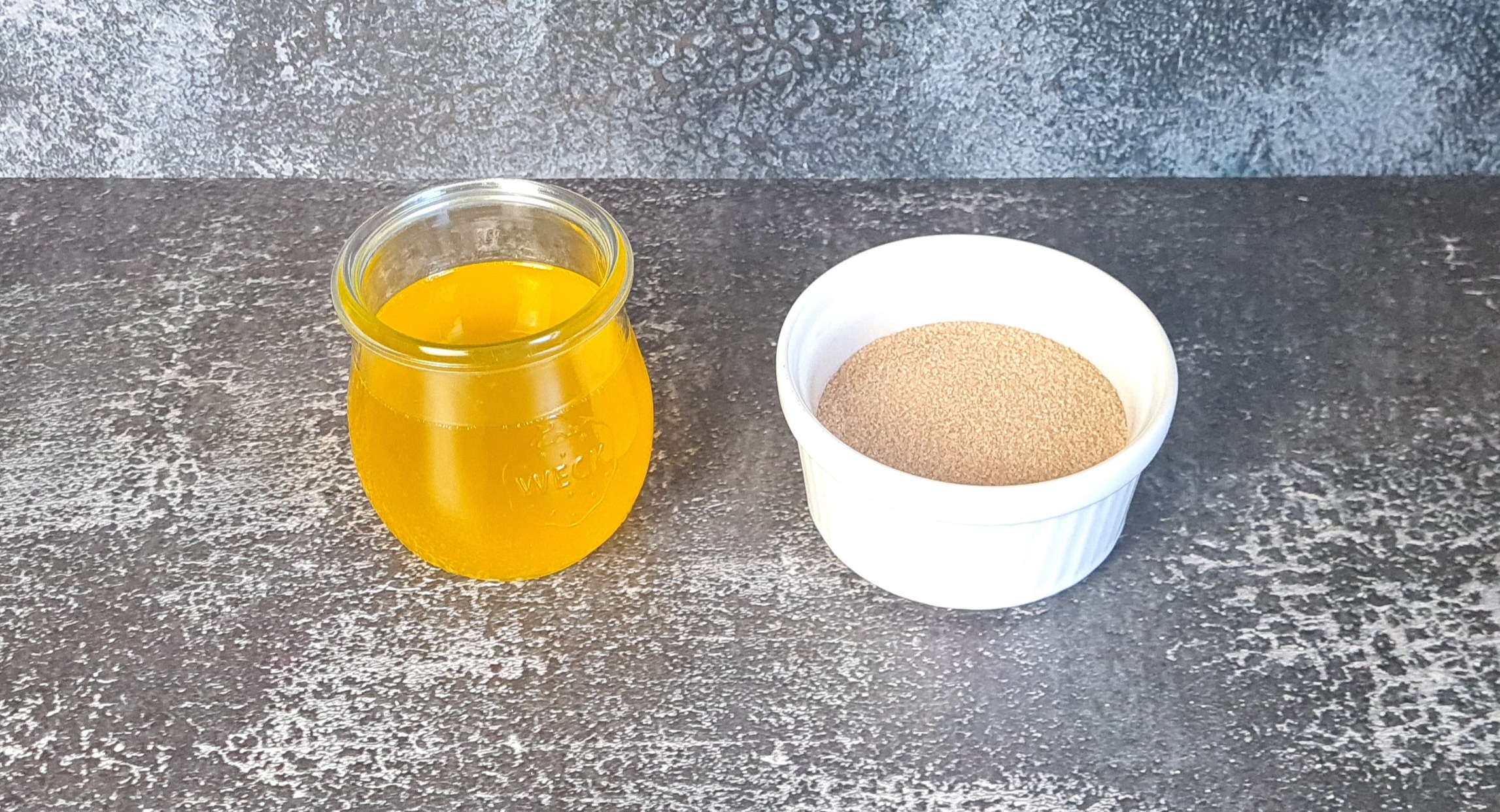 Den Zimt und Zucker miteinander vermischen und die Butter in einem kleinen Topf vorsichtig schmelzen, bis die Molke sich abgesetzt hat und die Butter klar aussieht. Die flüssige Butter für die weitere Verarbeitung etwas abkühlen lassen.