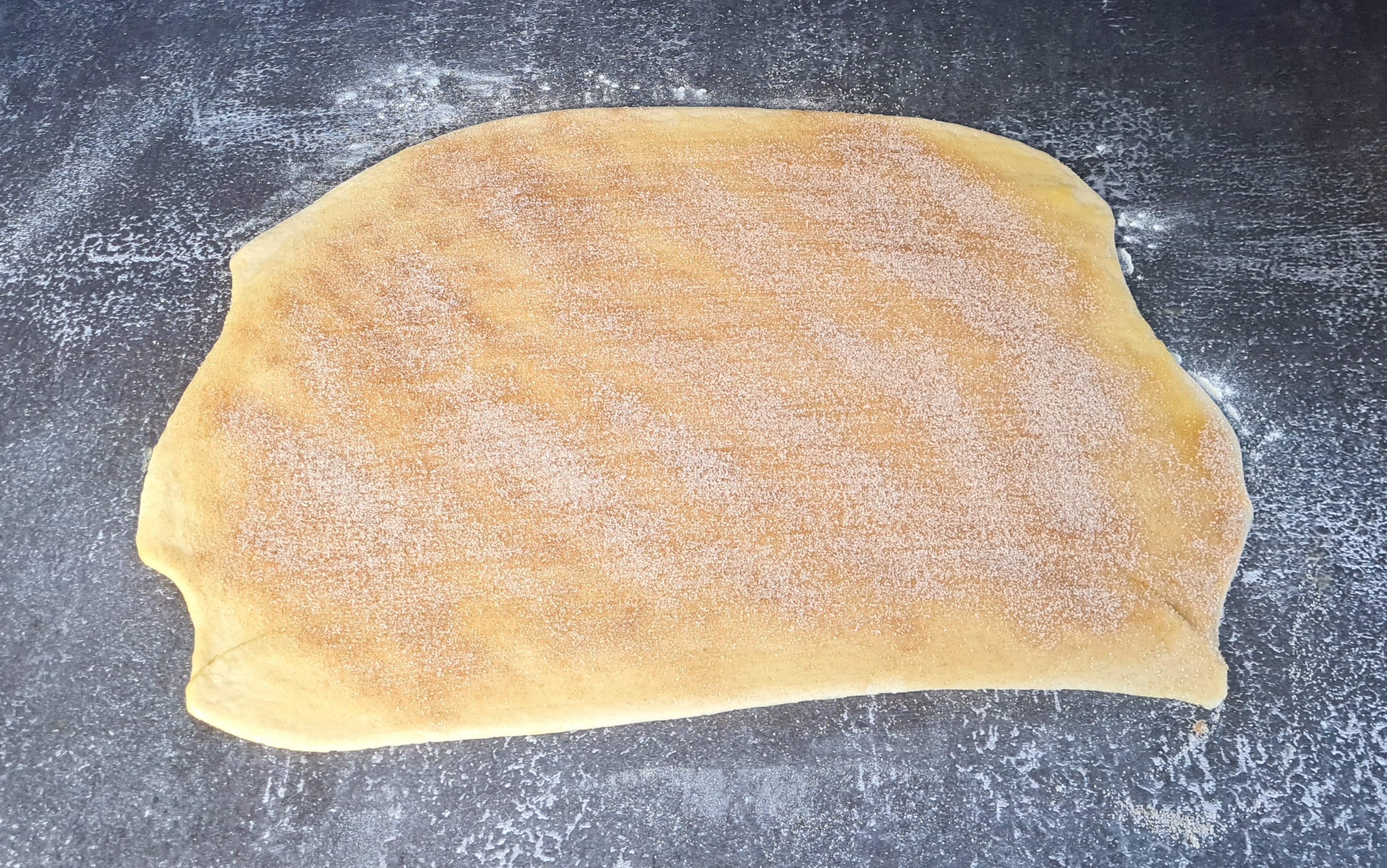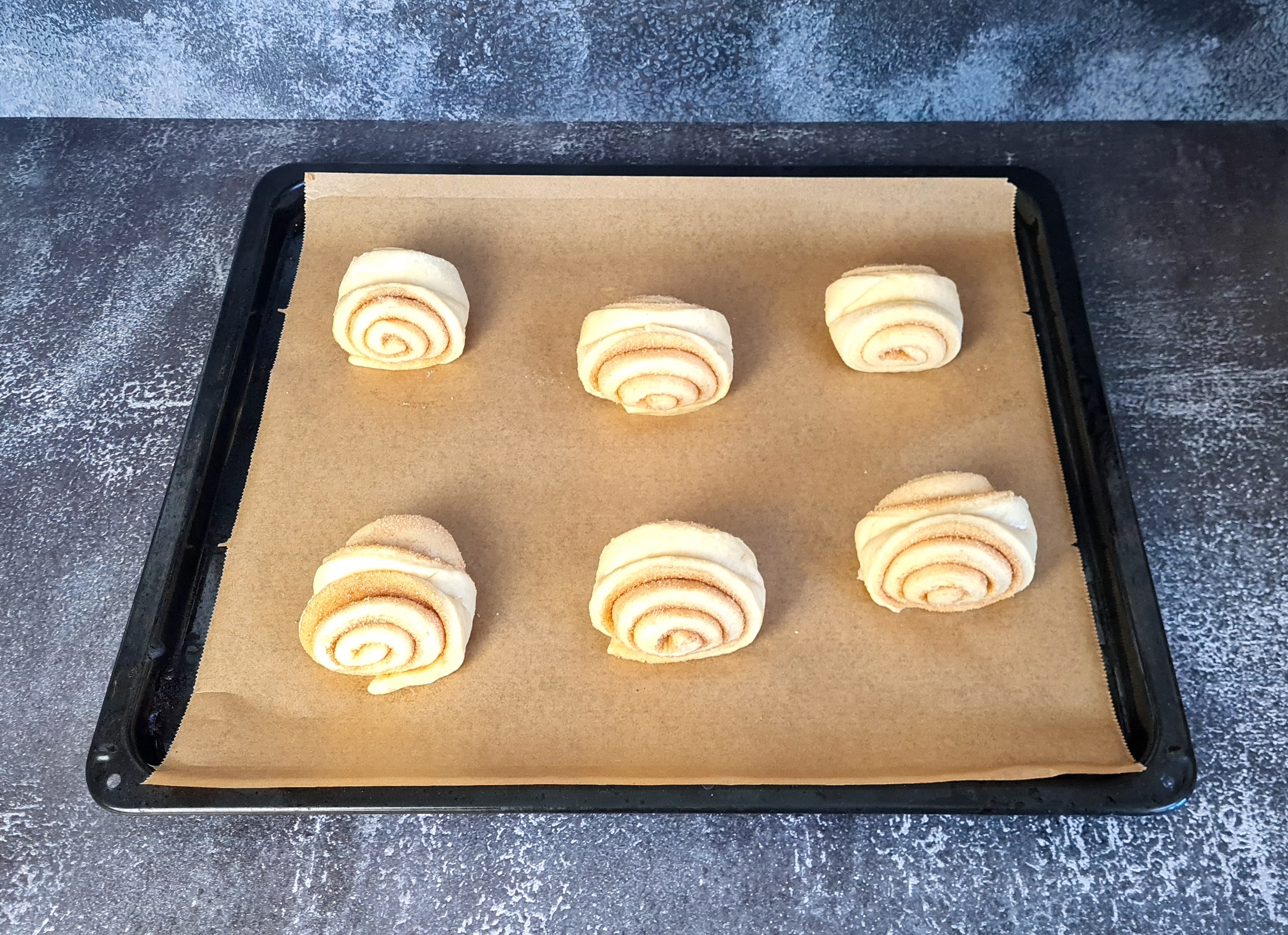 Den ausgerollten Teig mit der geklärten Butter bestreichen und den Zimtzucker darauf bestreuen. Den Plunderteig nun von der kurzen Seite her aufrollen und diese dann in etwa 6 Stücke à 5cm schneiden. In jedes Stück mit dem Stiel eines Holzlöffels parallel zu den Schnittkanten eine tiefe Kerbe in die Mitte setzen. Die Schnittkanten mit den Fingern ein wenig in Richtung der Kerbe drücken, damit sie später schön aufspringen.