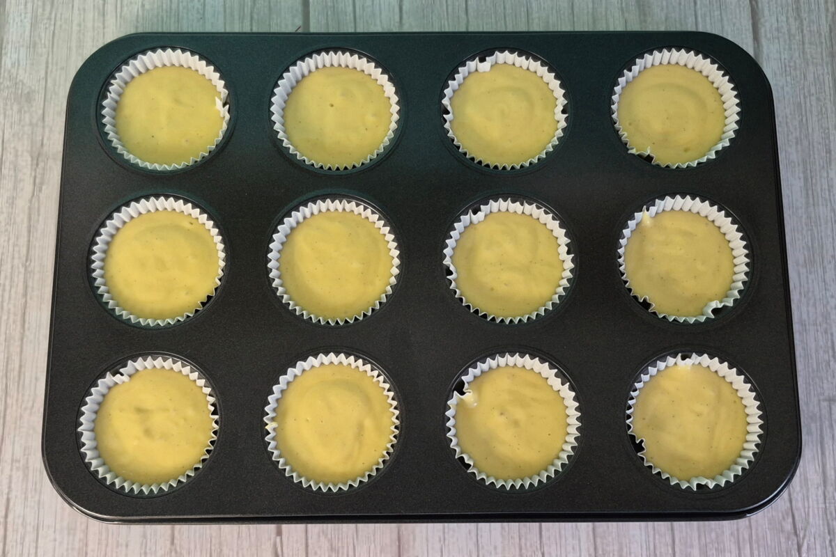 Den fertigen Teig mithilfe eines Eisportionierers alternativ mit 2 Esslöffel gleichmäßig auf die Muffinförmchen verteilen und für etwa 25 Minuten backen.