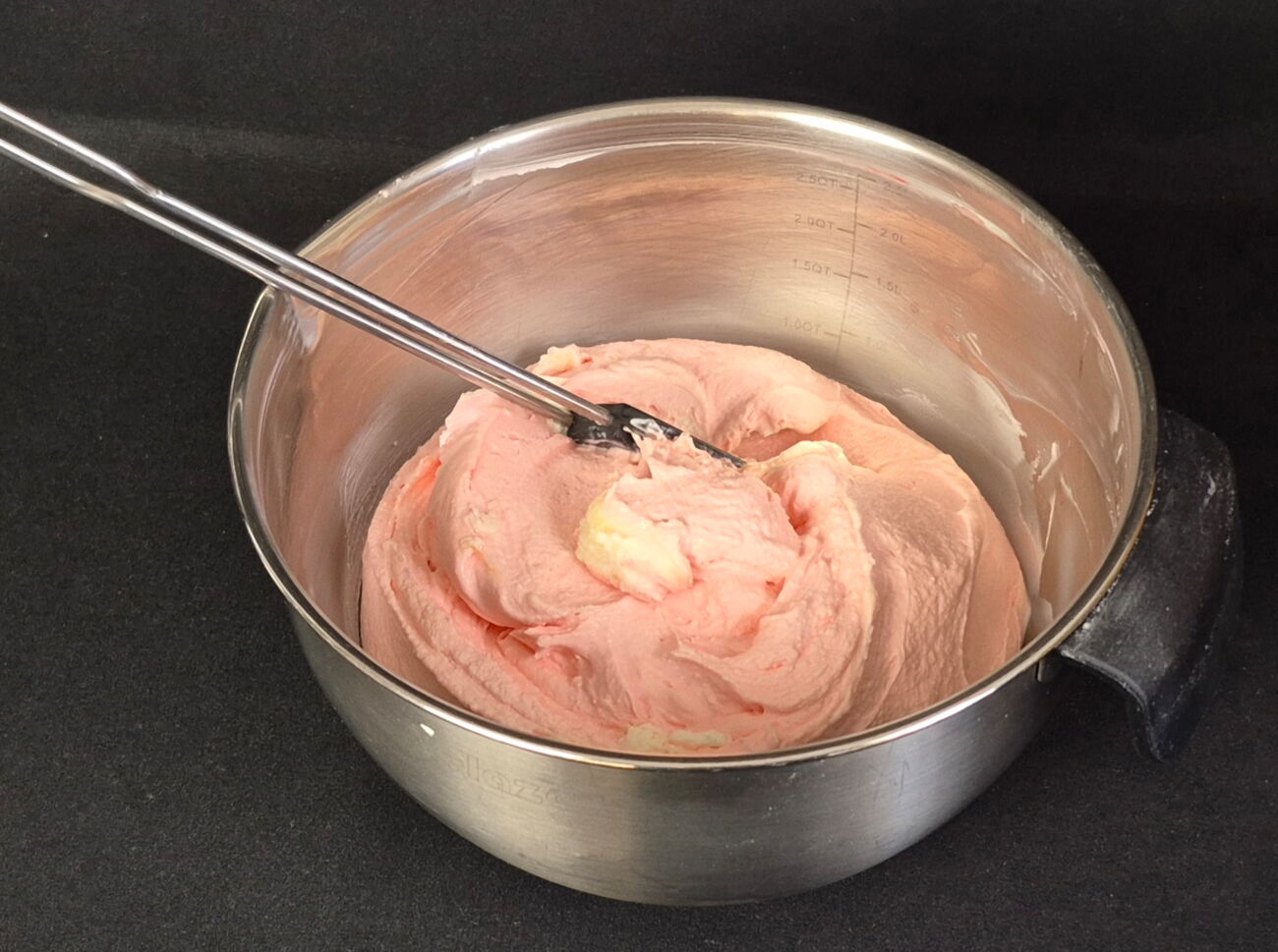 Für den Muffinteig die weiche Butter zusammen mit dem Zucker und etwas der Vanillepaste aufschlagen. Währenddessen das Weizenmehl mit dem Backpulver und einer Prise Salz mischen. Die Eier nacheinander unterrühren und für einige Minuten weiterschlagen. Im Anschluss die Mehlmischung dazu sieben und mit der Milch zu einem geschmeidigen Teig verrühren. Nach Belieben noch etwas rote Lebensmittelfarbe zugeben.